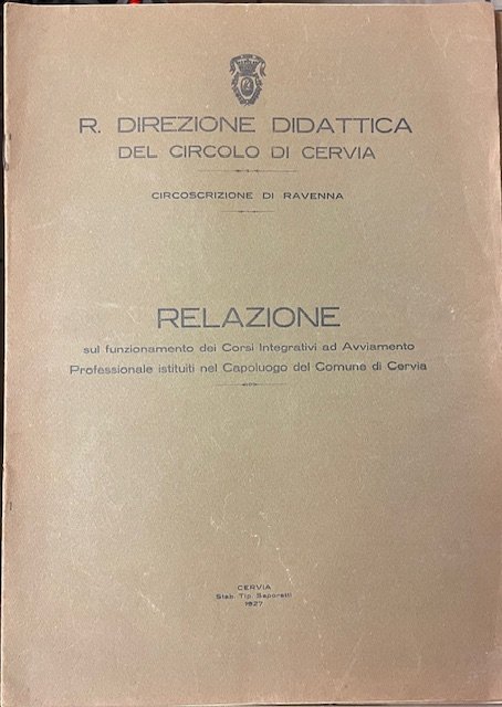 R. DIREZIONE DIDATTICA DEL CIRCOLO DI CERVIA - CIRCOSCRIZIONE DI RAVENNA. RELAZIONE sul funzionamento dei CORSI INTEGRATIVI ad AVVIAMENTO PROFESSIONALE istituiti nel CAPOLUOGO del COMUNE di CERVIA.
