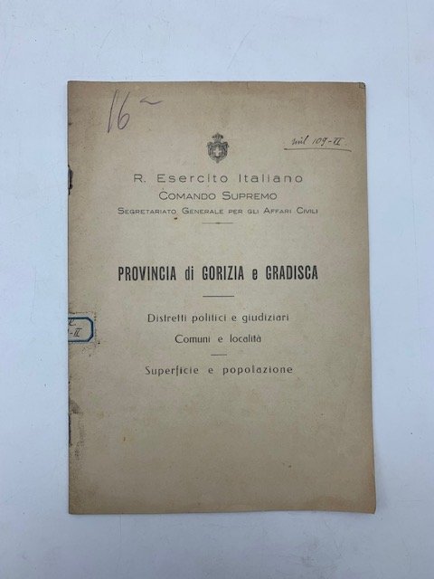 In 8 (cm 16,5 x 24), pp. 26. Brossura editoriale. Tabelle nel testo comprendenti, per la provincia di Gorizia e Gradisca, i Comuni e le localita', ripartiti per distretti politici e giudiziari, con l'indicazione della superficie del territorio comunale in ettari e con la popolazione presente secondo l'ultimo censimento del 1910.