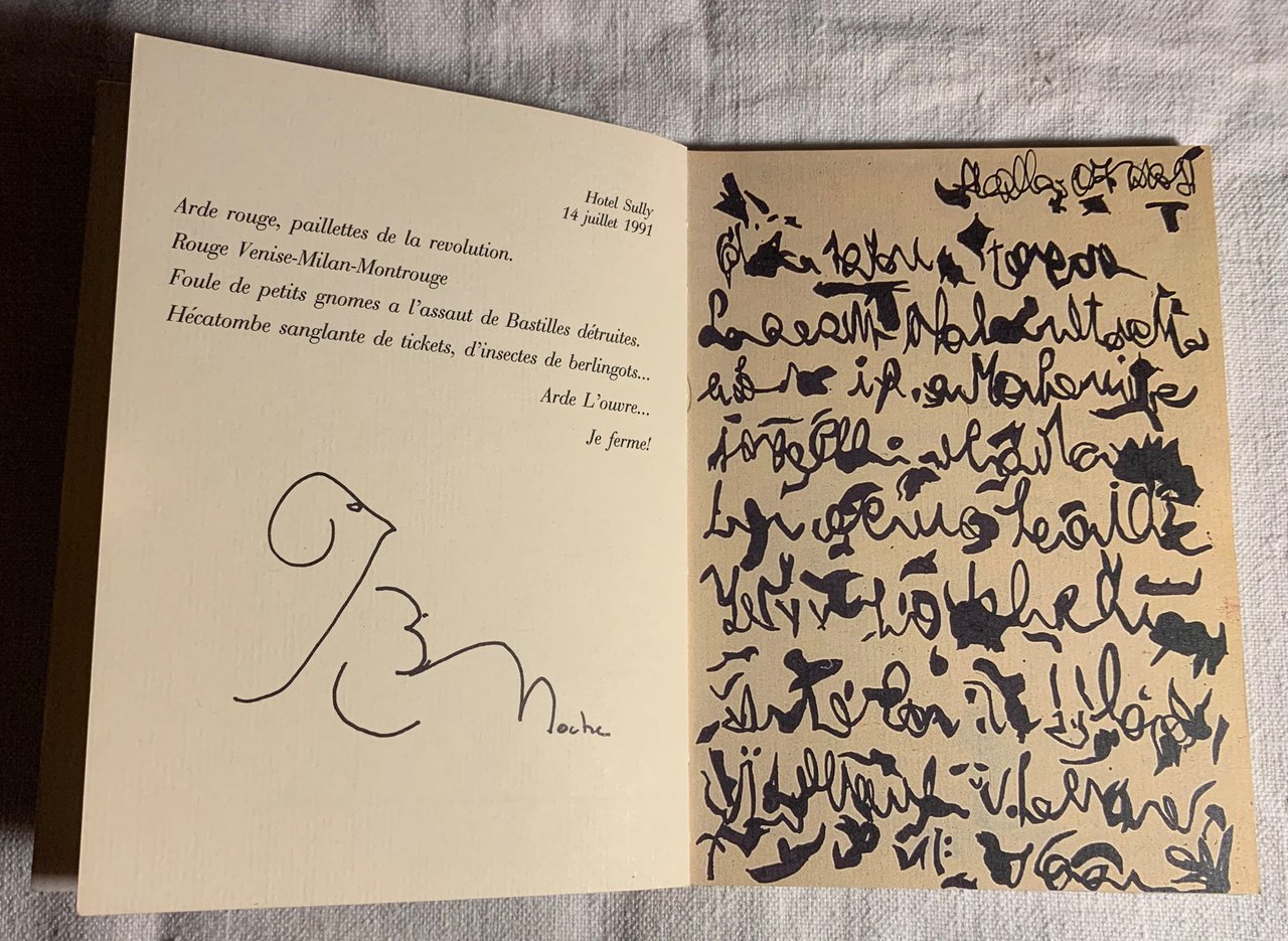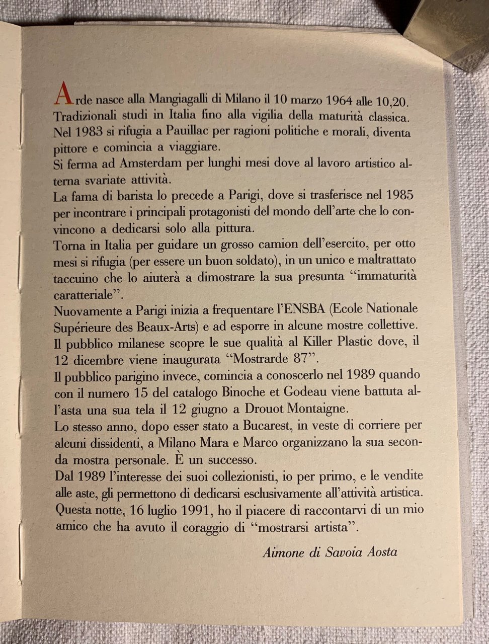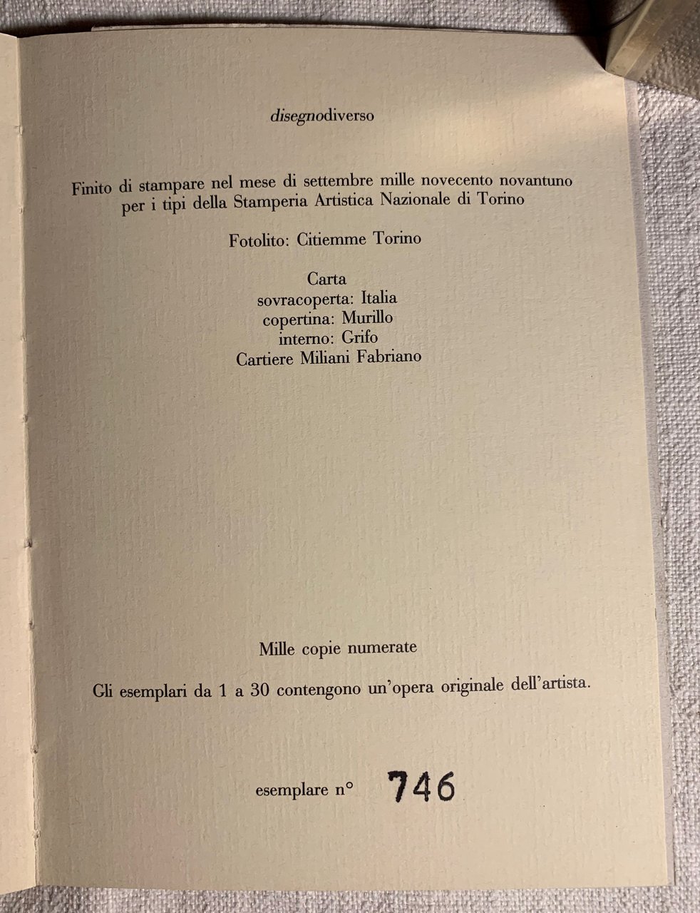 I ed. limitata a settecento copie numerate. Gli esemplari da 1 a 30 contengono un'opera originale dell'artista (esemplare n^ 746, senza opera originale dell'artista. Finito di stampare nel mese di settembre mille novecento novantuno). Collana a cura di Paola Gribaudo disegnodiverso. XVI/ (64) in carta Grifo avorio/ brossura in carta Murillo rosso porpora / sovraccoperta in carta Italia grigio chiarissimo con grafica in rosso porpora. La carta del volume proviene dalle Cartiere Miliani Farbriano. Illustrazioni con testi a colori. Stato buono. Indice: s.t.; Arde (Hotel Sully, 14 juillet 1991) - immagini - biografia; Aimone di Savoia Aosta.