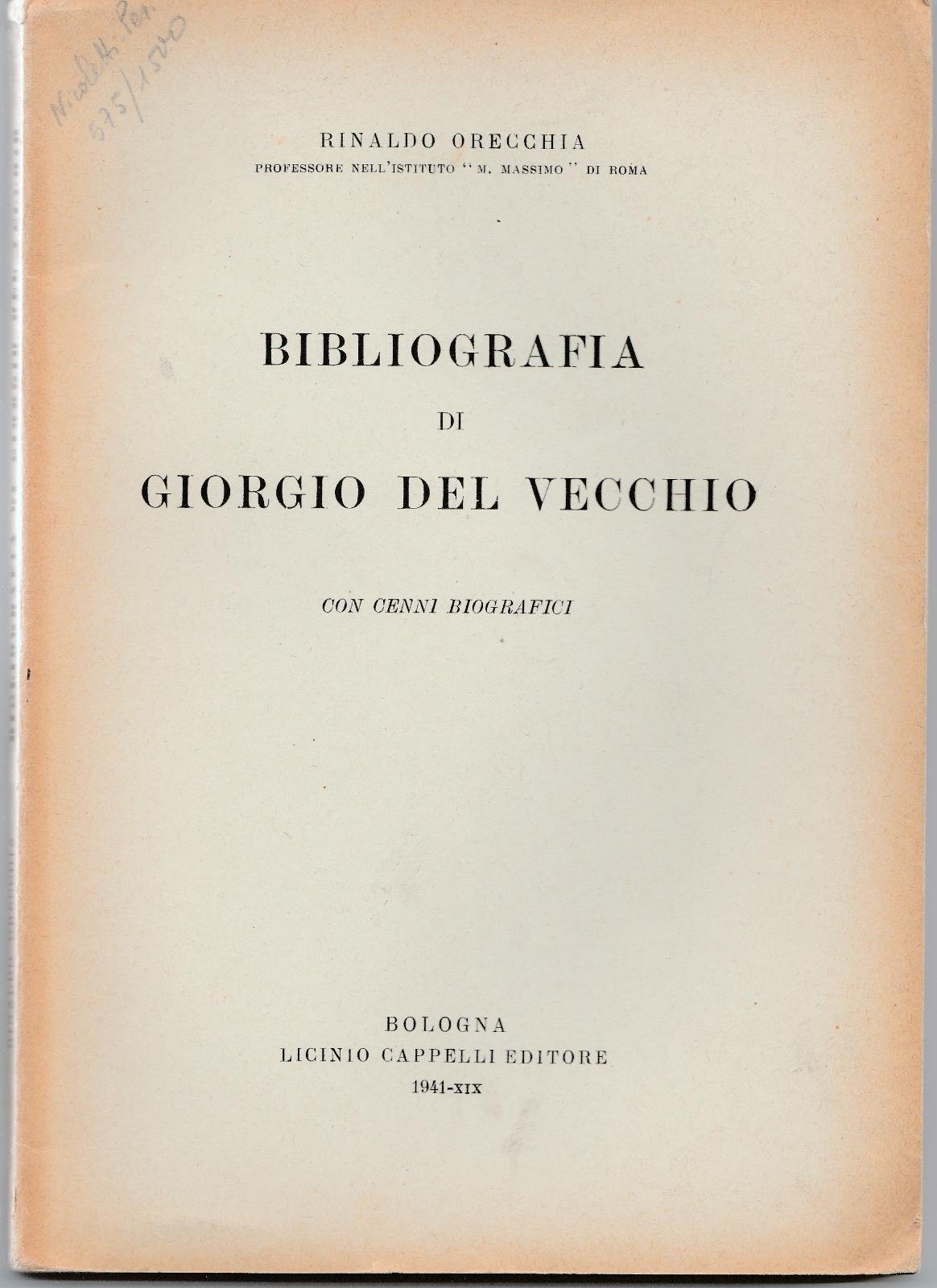 RINALDO ORECCHIA BIBLIOGRAFIA DI GIORGIO DEL VECCHIO CON CENNI BIOGRAFICI BOLOGNA LICINO CAPPELLI 1941 L 4608 COPERTINA MORBIDA EDITORIALE CON FIRMA DI POSSESSO A MATITA ALL'ANGOLO SUPERIORE DEL PIATTO ANTERIORE, LIEVE BRUNITURA AI MARGINI, DORSO BRUNITO CON PICCOLA SPELLATURA AL MARGINE SUPERIORE, LEGGERE FIORITURE ALLE PRIME DUE PAGINE, RITRATTO DI GIORGIO DEL VECCHIO AL FRONTESPIZIO, LIEVE BRUNITURA AL MARGINE ESTERNO DELLE PAGINE INTERNE IN BUONO STATO 99†CM. 24,5 X 17