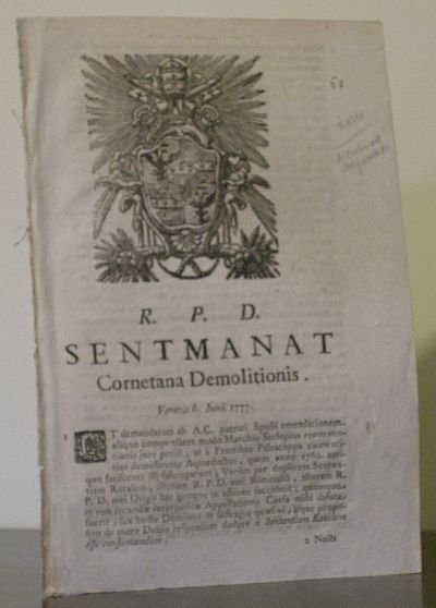 In 8? (cm 26,5), Leg. originale, pagg.4 n.n. cop. moderna carta Varese, bello stemma papale di Pio VI xilogr. (cm 10,5x8,5 ca.), capolettera xil., testo in latino suddiviso in 5 paragrafi, buon es. Sentenza che conferma la sentenza rotale circa il diritto dei fratelli Falzacappa di demolire e sostituire l'acquedotto nel loro fondo.