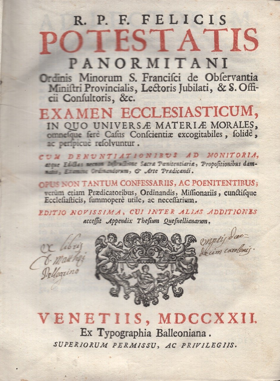 R. p. f. Felicis Potestatis panormitani […] examen ecclesiasticum, in quo universae materiae morales, omnesque ferè casus conscientiae excogitabiles, solidè ac perspicuè resolvuntur: cum denunciationibus ad monitoria, atque edicta; […] opus non tantum confessariis, ac poenitentibus […]. Editio novissima, cui praeter alias additiones accessit Appendix Thesium Quesnellianarum.