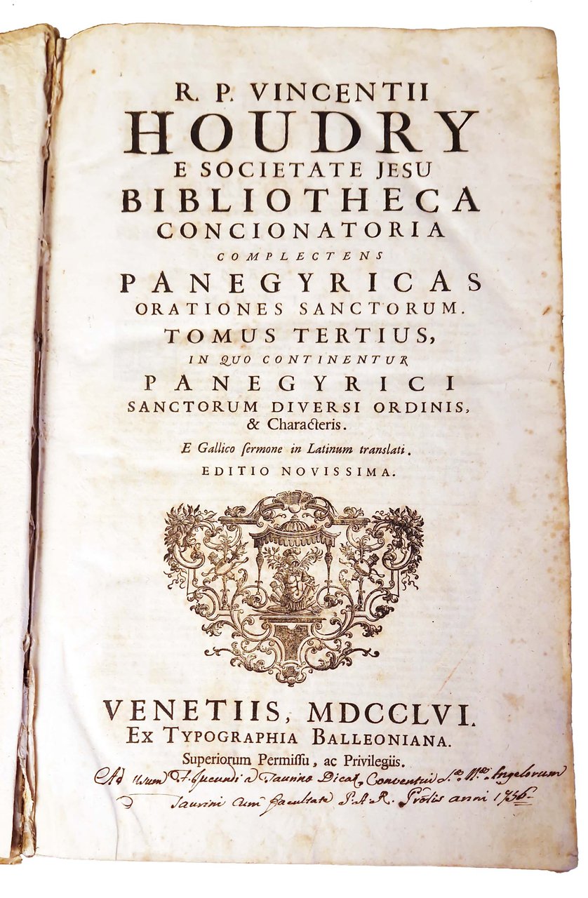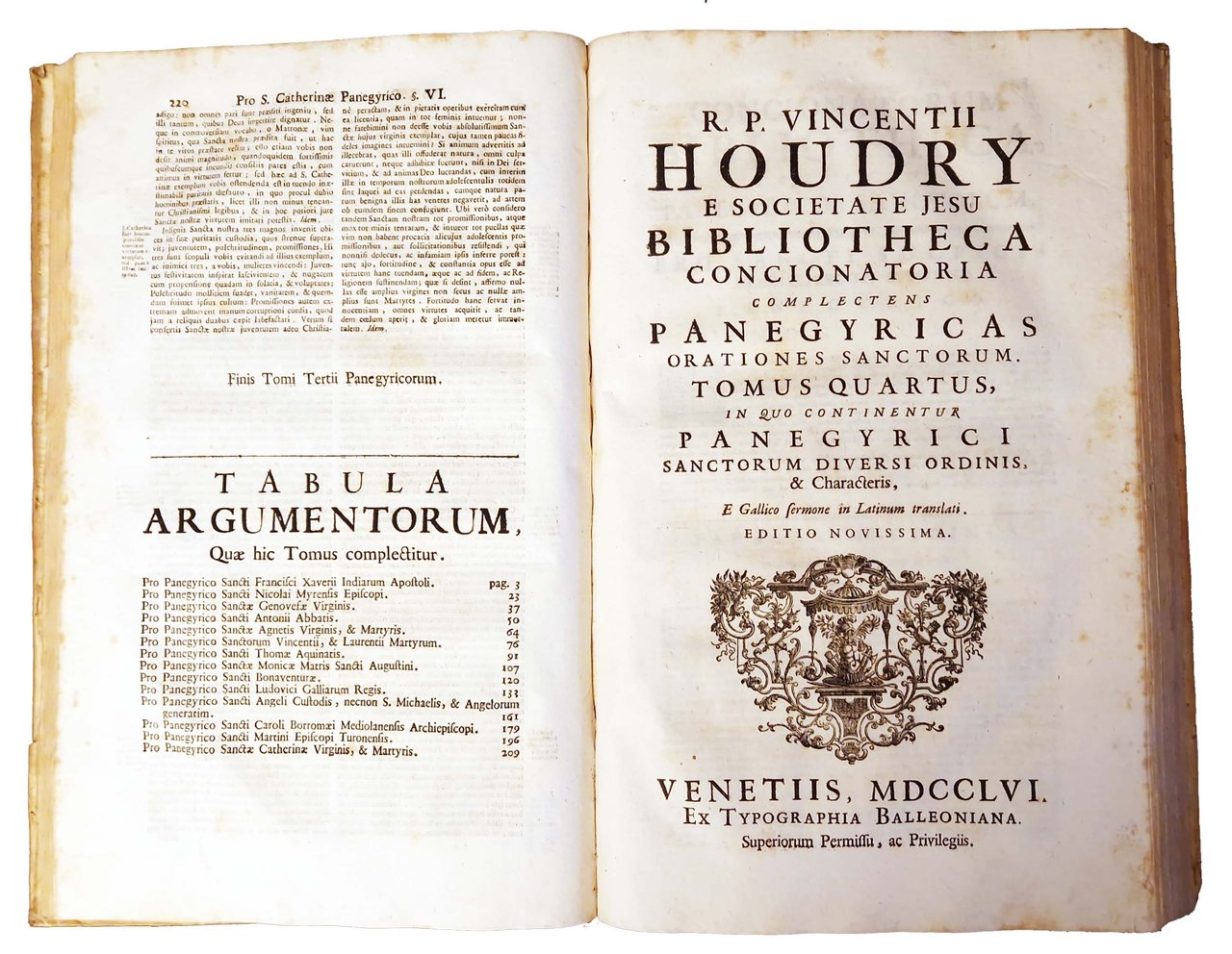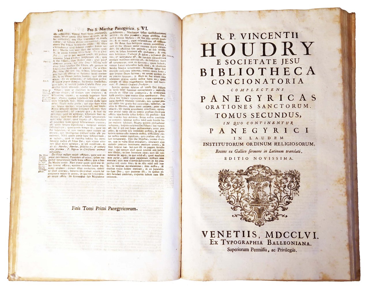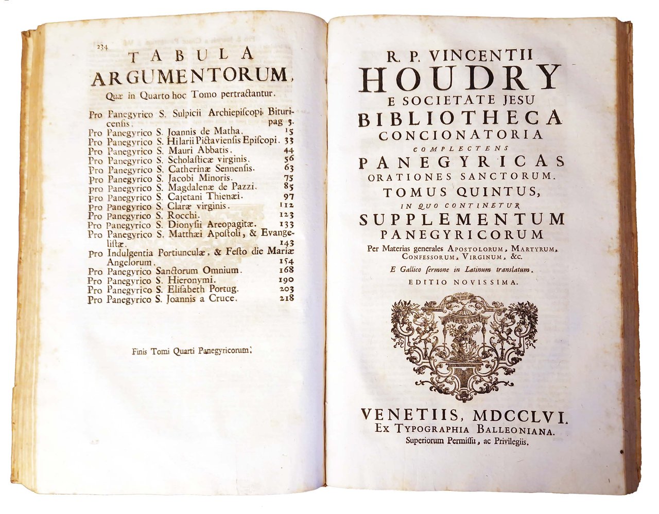 in-folio, 380x230 mm, leg. coeva in pergamena, con dorso a sei nervi; opera in 5 tomi, legati in 2 volumi; fregio xilografico sui frontespizi; testatine, iniziali e finalini xilografici. Testo su due colonne. L'opera è composta da: [1.]: Tomus primus, in quo continentur sanctorum, de quibus in Novo testamento sermo est, Panegyrici è gallico sermone in latinum translati. Pp. xvi, 248. [2.]: Tomus secundus in quo continentur Panegyrici in laudem institutorum ordinum religiosorum, recens ex gallico sermone in latinum translati. Pp 252. [3.]: Tomus tertius, in quo continentur panegyrici sanctorum diversi ordinis, & characteris. E gallico sermone inlatunum translati. Pp. 220. [4.]: Tomus quartus, in quo continentur Panegyrici sanctorum diversi ordinis, & characteris, e gallico sermone in latinum translati. Pp. 234. [5.]: Tomus quintus, in quo continentur supplementum Panegyricorum per materias generales apostolorum, martyrum, confessorum, virginum, &c. E gallico sermone in latinum translatum. Pp. 244. Bella edizione veneta del Baglioni di questa vasta raccolta di orazioni e preghiere dei santi, a cura di Vincent Houdry (1631-1729; predicatore e scrittore gesuita francese). Rif.: IT\ICCU\TO0E\048147. OCLC, 1051101880. Cond.: Segni d'uso alla legatura (macchie e abrasioni, strappi parziali alle cerniere e mancanze in corrispondenza delle cuffie, titoli molto sbiaditi). Carte abbastanza pulite, ma con presenza di fioriture. Esemplari nel complesso in condizioni decisamente buone.