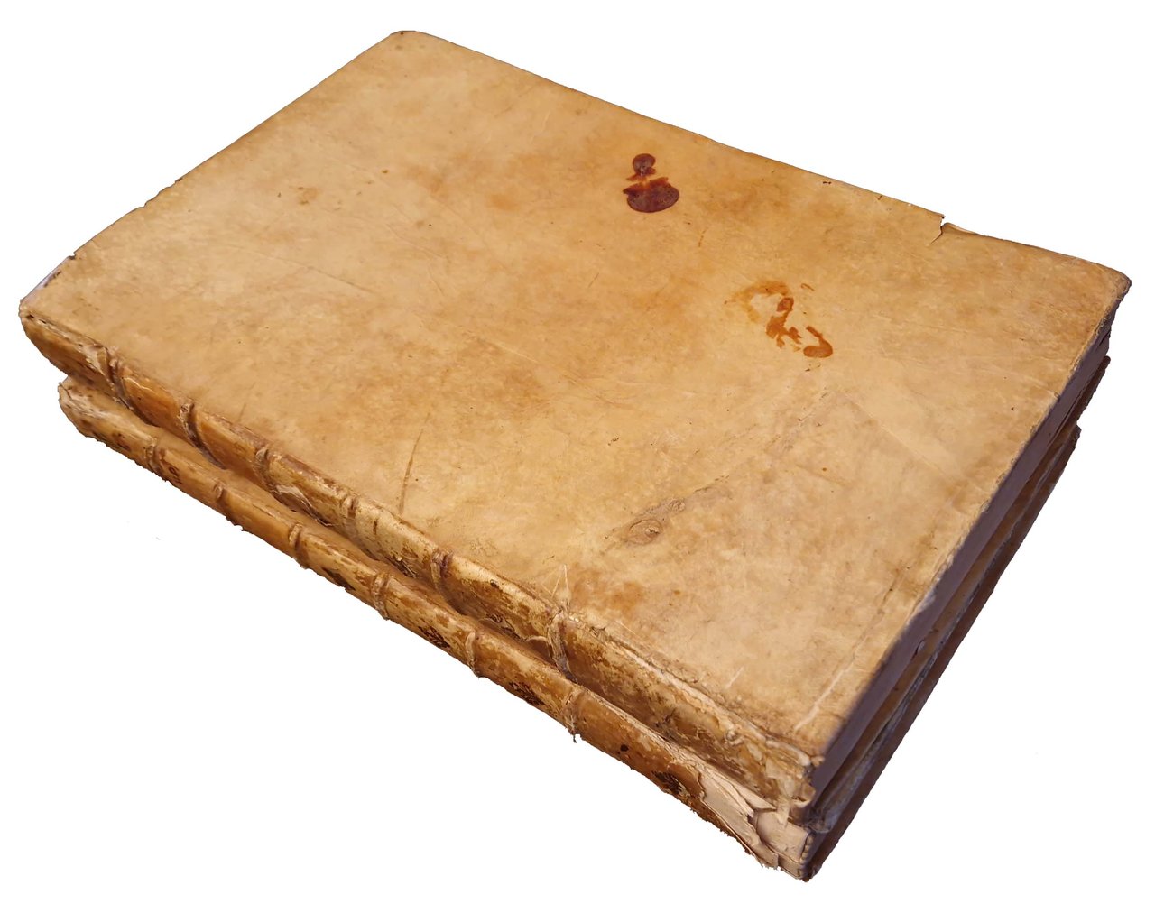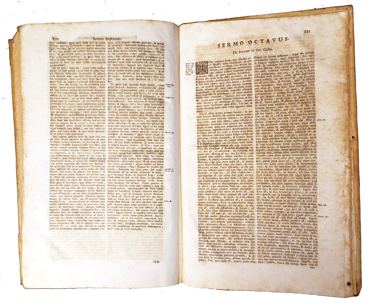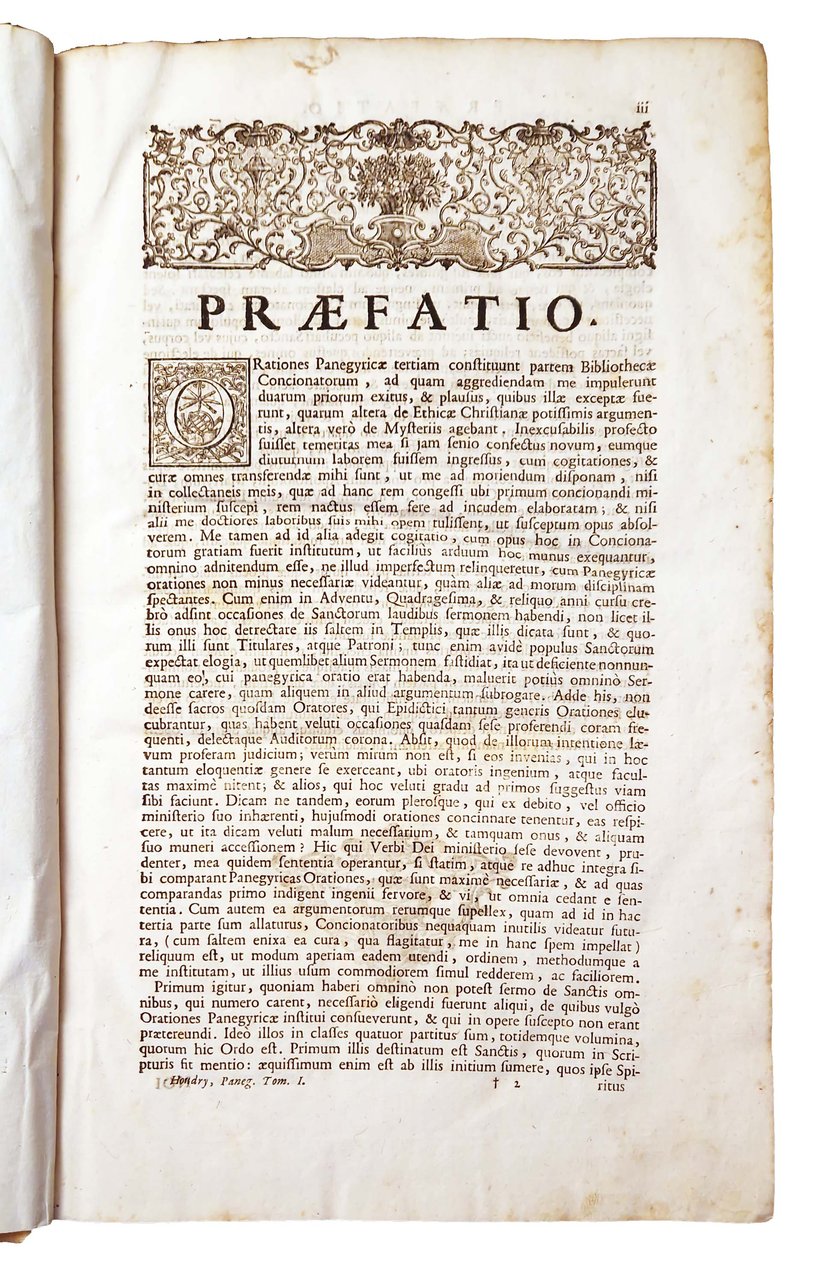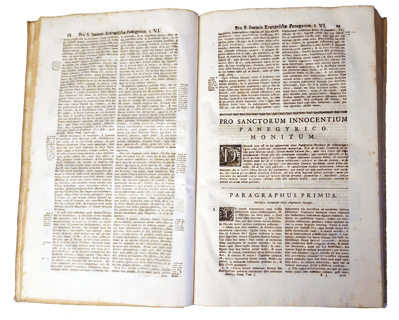 in-folio, 380x230 mm, leg. coeva in pergamena, con dorso a sei nervi; opera in 5 tomi, legati in 2 volumi; fregio xilografico sui frontespizi; testatine, iniziali e finalini xilografici. Testo su due colonne. L'opera è composta da: [1.]: Tomus primus, in quo continentur sanctorum, de quibus in Novo testamento sermo est, Panegyrici è gallico sermone in latinum translati. Pp. xvi, 248. [2.]: Tomus secundus in quo continentur Panegyrici in laudem institutorum ordinum religiosorum, recens ex gallico sermone in latinum translati. Pp 252. [3.]: Tomus tertius, in quo continentur panegyrici sanctorum diversi ordinis, & characteris. E gallico sermone inlatunum translati. Pp. 220. [4.]: Tomus quartus, in quo continentur Panegyrici sanctorum diversi ordinis, & characteris, e gallico sermone in latinum translati. Pp. 234. [5.]: Tomus quintus, in quo continentur supplementum Panegyricorum per materias generales apostolorum, martyrum, confessorum, virginum, &c. E gallico sermone in latinum translatum. Pp. 244. Bella edizione veneta del Baglioni di questa vasta raccolta di orazioni e preghiere dei santi, a cura di Vincent Houdry (1631-1729; predicatore e scrittore gesuita francese). Rif.: IT\ICCU\TO0E\048147. OCLC, 1051101880. Cond.: Segni d'uso alla legatura (macchie e abrasioni, strappi parziali alle cerniere e mancanze in corrispondenza delle cuffie, titoli molto sbiaditi). Carte abbastanza pulite, ma con presenza di fioriture. Esemplari nel complesso in condizioni decisamente buone.