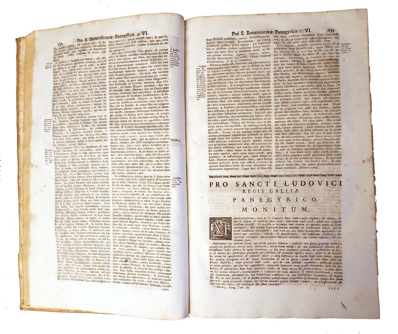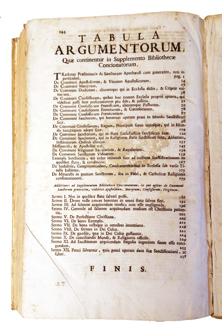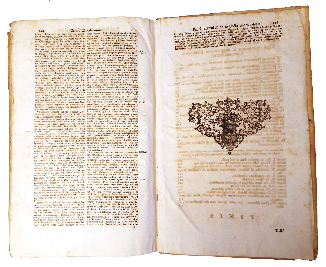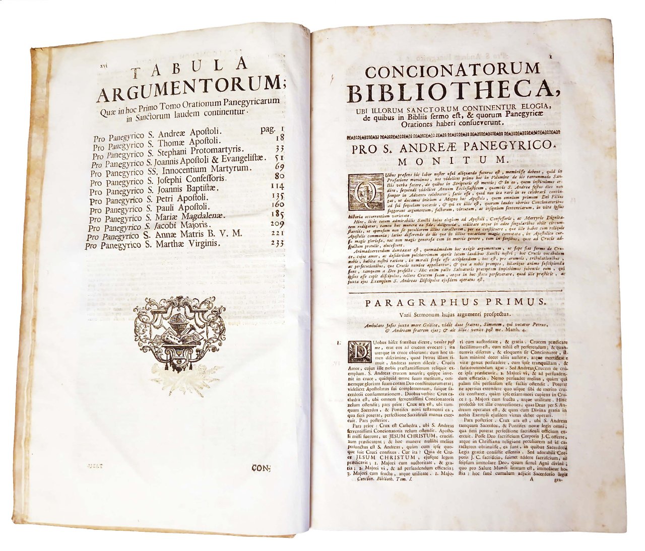 in-folio, 380x230 mm, leg. coeva in pergamena, con dorso a sei nervi; opera in 5 tomi, legati in 2 volumi; fregio xilografico sui frontespizi; testatine, iniziali e finalini xilografici. Testo su due colonne. L'opera è composta da: [1.]: Tomus primus, in quo continentur sanctorum, de quibus in Novo testamento sermo est, Panegyrici è gallico sermone in latinum translati. Pp. xvi, 248. [2.]: Tomus secundus in quo continentur Panegyrici in laudem institutorum ordinum religiosorum, recens ex gallico sermone in latinum translati. Pp 252. [3.]: Tomus tertius, in quo continentur panegyrici sanctorum diversi ordinis, & characteris. E gallico sermone inlatunum translati. Pp. 220. [4.]: Tomus quartus, in quo continentur Panegyrici sanctorum diversi ordinis, & characteris, e gallico sermone in latinum translati. Pp. 234. [5.]: Tomus quintus, in quo continentur supplementum Panegyricorum per materias generales apostolorum, martyrum, confessorum, virginum, &c. E gallico sermone in latinum translatum. Pp. 244. Bella edizione veneta del Baglioni di questa vasta raccolta di orazioni e preghiere dei santi, a cura di Vincent Houdry (1631-1729; predicatore e scrittore gesuita francese). Rif.: IT\ICCU\TO0E\048147. OCLC, 1051101880. Cond.: Segni d'uso alla legatura (macchie e abrasioni, strappi parziali alle cerniere e mancanze in corrispondenza delle cuffie, titoli molto sbiaditi). Carte abbastanza pulite, ma con presenza di fioriture. Esemplari nel complesso in condizioni decisamente buone.