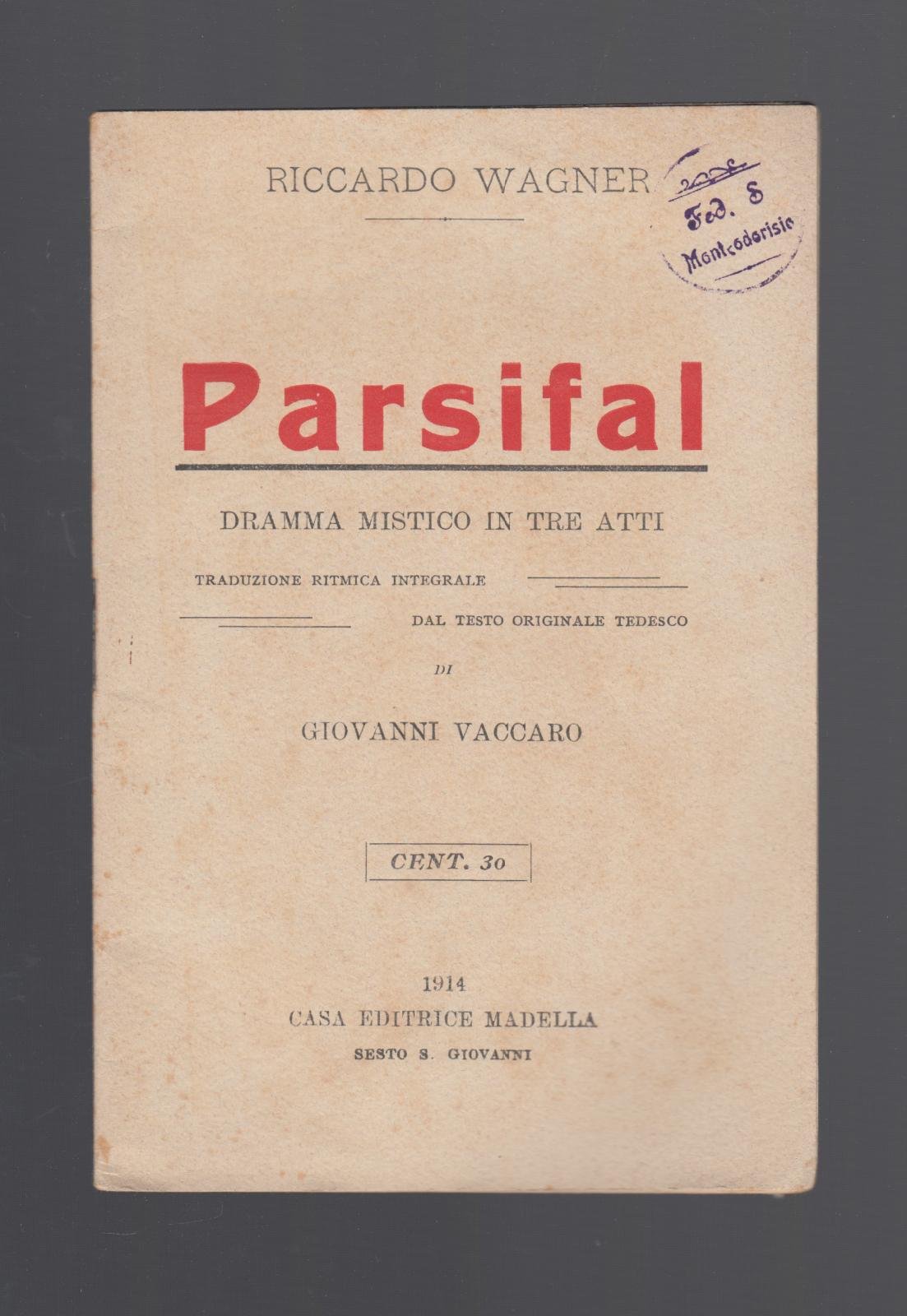 R. WAGNER PARSIFAL CASA EDITRICE MADELLA 1914 LIBRETTO D'OPERA COPERTINA EDITORIALE CON TIMBRO VECCHIO TIMBRO ALL'ANGOLO SUPERIORE DESTRO, TIMBRO PRESENTE ANCHE ALLA PRIMA PAGINA, PIEGHE AGLI ANGOLI, N. PAG 59 CM. 18 X 12