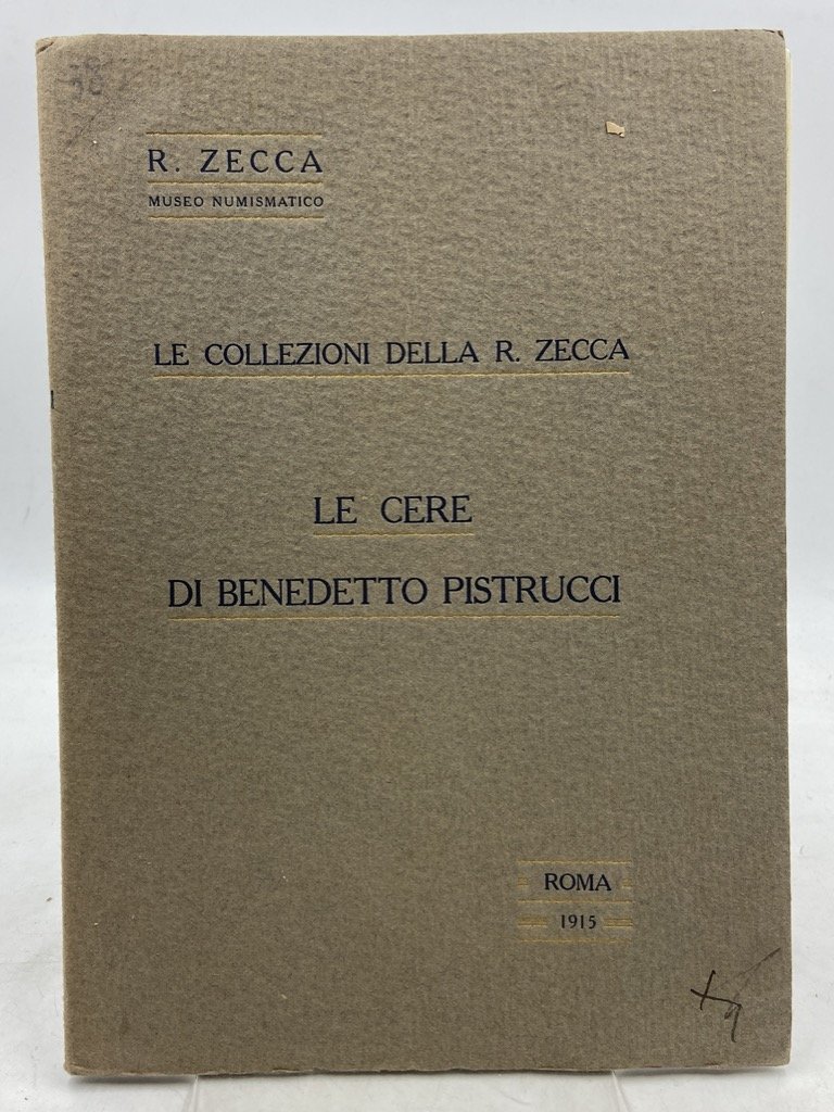Brossura editoriale, cm 24 x 17, pp 65 (3), 35 figure in nero nel testo. Lievemente allentata la legatura. Fascicolo monografico dedicato all'incisore di medaglie e pietre Benedetto Pistrucci, nato a Roma nel 1783 e trasferitosi nel 1815 in Inghilterra, dove morì nel1855; nel Regno Unito Pistrucci creò il suo più celebre lavoro, il San Giorgio che ancora figura sulle sterline. Il fascicolo presenta la collezione di cere dell'artista, acquistata dallo stato italiano nel 1910 e conservata presso il Museo della Zecca di Roma; l'elenco delle opere è preceduto da un saggio storico-biografico.