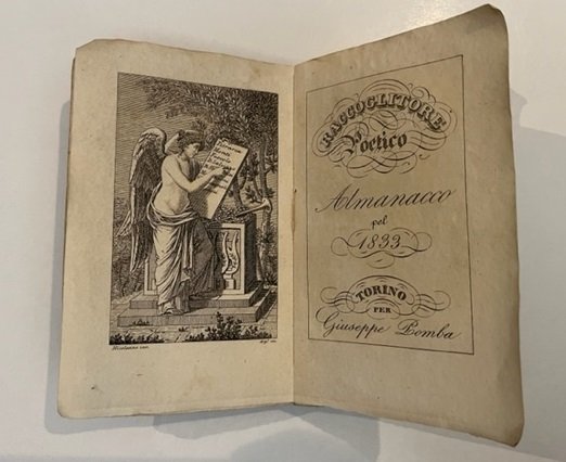In 24 (cm 8,5 x 13), pp. (2) + 178 + (2) con tavola incisa all'antiporta. Macchietta alle pp. 67-70. Brossura editoriale. Almanacco poetico con calendario. Sul versante della letteratura femminile si segnalano 6 componimenti di Cecilia De Luna Folliero, un sonetto in dialetto piemontese dal titolo "Un Piemonteis a nom d'soa Nasion", il componimento "In lode della signora Carolina Fabbretti attrice nella comica Compagnia al servizio.del Re di Sardegna", versi di Schiller in traduzione italiana, di Manzoni, di Pier Alessandro Paravia; ecc. Cecilia De Luna Folliero nacque a Napoli dove mori' a 78 anni nel 1870. Visse in America ed in Francia. Scrittrice e poetessa, coltivo' anche gli studi di filosofia morale. Scrisse l'opera "Sull'educazione delle donne" premiata nel 1837 con la medaglia d'oro della Societa' Statistica di Parigi. Carolina Fabbretti ricopri' il ruolo di "generica" all'interno della Compagnia Reale Sarda e fu in seguito sostituita nel 1837 dalla giovane Adelaide Ristori destinata a divenire una delle maggiori attrici italiane dell'800.