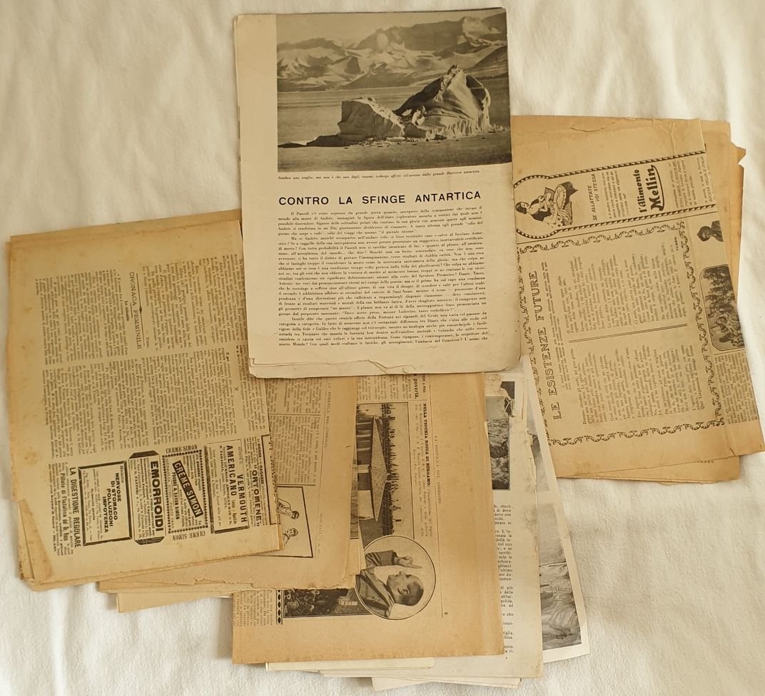 Raccolta di 20 ritagli di giornale sul Polo Nord. Gli articoli sono stati tratti da giornali d'epoca e non tutti sono completi, sono presenti anche planches sciolte. Alcuni riguardano flora e fauna, altri etnologia ed esplorazioni (Come si uccide un orso bianco di Salvatore Aponte (la lettura), la sfinge antartica di Giuseppe Guerra, "i Sahara di ghiaccio" di Marco Nerilli tratto da II gazzettino illustrato 1928, "Spedizione del Norge" da "La domenica del corriere 1926, "L'Alaska" da Illustrazionee del popolo 1942, "Orribili uomini della neve una nuova razza", "Naufragi sui ghiacci" di Cesco Tomaselli da La domenica del corriere 1937, "La morte di Danco", "Un'isola che scompare dalla carta geografica Terra di Gillis" da Illustrazione del popolo 1935, "Tra i misteri dell'artico" da La domenica del corriere 1927, "il Polo Nord da Verne a Wilkins" da La Domenica del corriere 1931, "Gli eschimesi" di Biordi da La domenica del corriere, "Un avevntura in mezzo ai ghiacci" da La domenica del corriere 1927). In buone condizioni. Collection of 20 clippings about Poles. The articles has been taken from original magazines, not all are complete, there are also loose plates. Some are about animals, othrs about ethnology and explrations (Come si uccide un orso bianco di Salvatore Aponte (la lettura), la sfinge antartica di Giuseppe Guerra, "i Sahara di ghiaccio" di Marco Nerilli tratto da II gazzettino illustrato 1928, "Spedizione del Norge" da "La domenica del corriere 1926, "L'Alaska" da Illustrazionee del popolo 1942, "Orribili uomini della neve una nuova razza", "Naufragi sui ghiacci" di Cesco Tomaselli da La domenica del corriere 1937, "La morte di Danco", "Un'isola che scompare dalla carta geografica Terra di Gillis" da Illustrazione del popolo 1935, "Tra i misteri dell'artico" da La domenica del corriere 1927, "il Polo Nord da Verne a Wilkins" da La Domenica del corriere 1931, "Gli eschimesi" di Biordi da La domenica del corriere, "Un avevntura in mezzo ai ghiacci" da La domenica del corriere 1927). In good condition