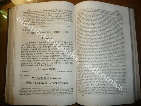 Copiosa fonte di notizie storiche riguardanti il periodo principale del primo Risorgimento italiano. Non comune e molto interessante per la comprensione degli avvenimenti politici e storici del tempo, rara raccolta dei documenti relativi alle vicende veneziane durante la Repubblica di Daniele Manin.