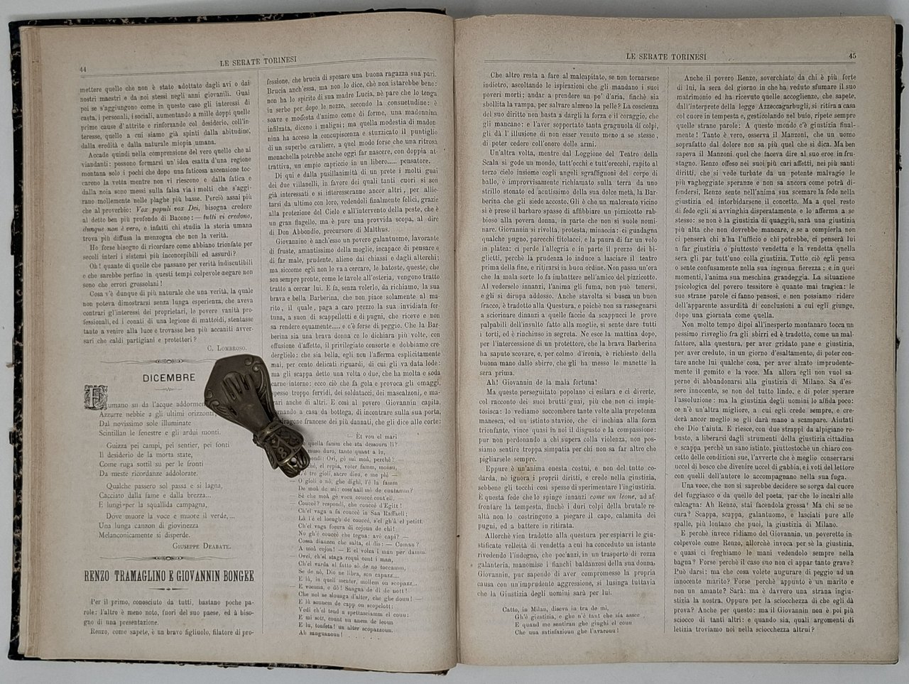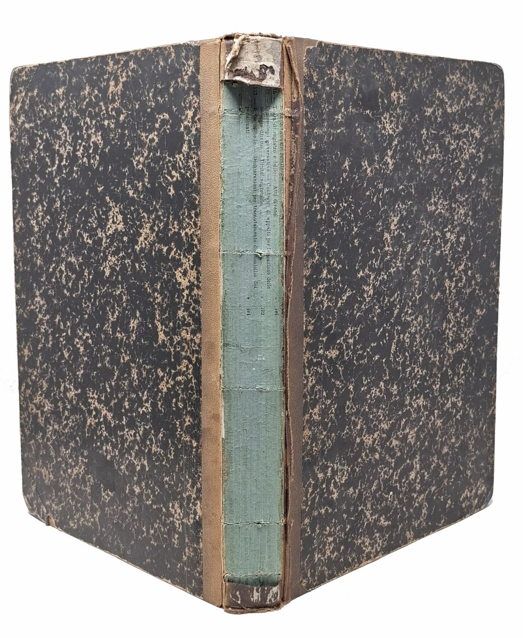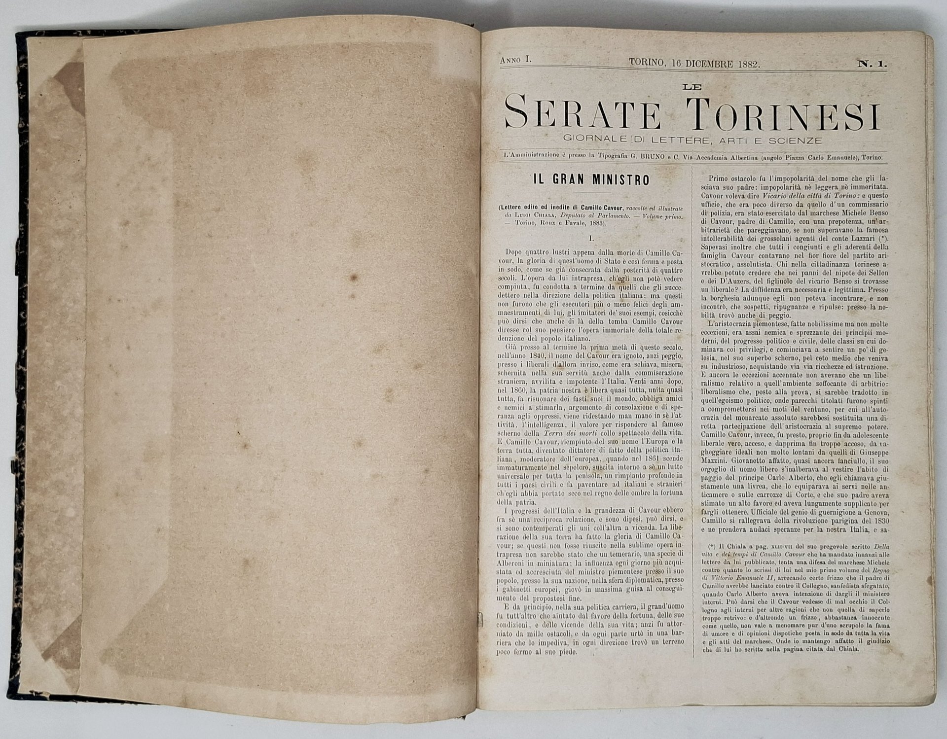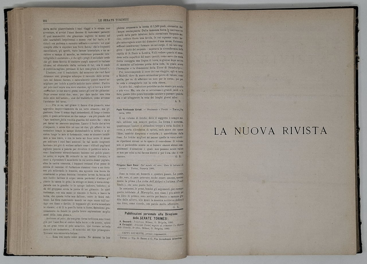In un unico volume (di formato 22 x 31,5 cm circa) sono stati rilegati i 29 numeri del giornale di lettere, arti e scienze 'LE SERATE TORINESI' (gli unici pubblicati autonomamente): dal numero 1, anno I del 16 dicembre 1882 al numero 29, anno I del 30 giugno 1883 e 24 numeri de 'LA NUOVA RIVISTA / Pubblicazione settimanale di politica, scienze, lettere ed arti': dal numero 123 anno III volume VI del 8 luglio 1883 al numero 147 dello stesso anno. Come dichiarato nell'avviso presente nell'ultimo numero de 'Le Serate Torinesi', tramite accordo con la Nuova Rivista, il suddetto giornale dall'8 luglio 1883 viene a far parte de 'La Nuova Rivista / Pubblicazione settimanale di politica, scienze, lettere ed arti'. Di conseguenza vi è continuità tra l'ultimo numero pubblicato de 'Le Serate Torinesi' e il numero 123 de 'La Nuova Rivista'. Si tratta di un insieme molto raro (per un totale di 53 numeri) di due pubblicazioni sulle quali scrissero i grandi nomi dell'intellighenzia' torinese dell'epoca. Tra le grandi firme de 'Le Serate Torinesi' annoveriamo Cesare Lombroso, Edmondo De Amicis, Michele e Marco Lessona, Carlo Pollonera, Lorenzo Camerano, . Mentre su 'La Nuova Rivista', oltre ad alcuni degli autori precedentemente citati, compaiono C. ferrero Cambiano, Ferdinando Gabotto, Federico Garlanda, Raffaele Cardon, Antonino Bertolotti, Giovanni Girelli, Gaudenzio Claretta, Francesco Stendardo. Saltuariamente compaiono anche altri nomi famosi quali ad esempio Giovanni Verga e Giuseppe Giacosa, Vittorio Bersezio. Ciascun numero de 'Le Serate Torinesi' consta di 8 pagine, mentre 'La Nuova Rivista' è costituita da 16 pagine. Stato di conservazione: manca il rivestimento del dorso della coperta, sporadici ed ordinari segni del tempo e dell'uso ma, nel complesso, una raccolta decisamente ben conservata. Copertina coeva cartonata rigida in cartone marmorizzato. Insieme sicuramente di difficile reperimento, interessante in quanto specchio della cultura, specie torinese, dell'epoca. A testimonianza dell'intenzione con cui sorge questa rivista, (quella di superare la dimensione locale della cultura torinese), la direzione del primo numero avvisa i lettori che 'avremo cura di dare ai nostri lettori le notizie letterarie, artistiche e scientifiche più importanti. Di quando in quando sarà dato un sunto degli articoli più notevoli delle principali notizie italiane, inglesi, francesi e tedesche'.