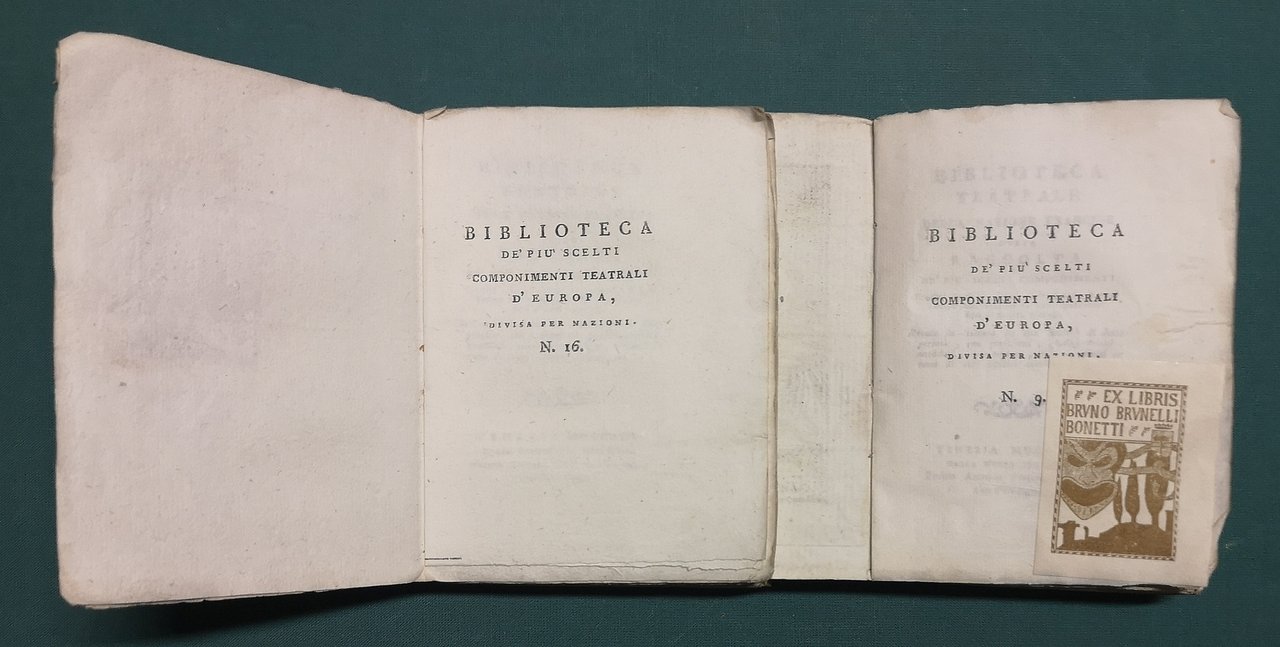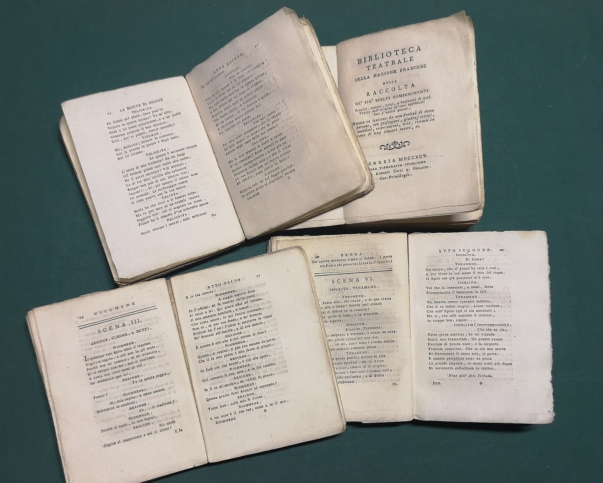 >27 vol. in-16 picc., caduno diviso in 2 parti di complessive 200 pp. circa e con un ritratto dell'autore finem. inc. in rame; leg. edit. cart. (con qualche mancanza ai dorsi). Il titolo all'occhietto recita: ''Biblioteca de' più scelti componimenti teatrali d'Europa, divisa in nazioni''. Tutto il pubblicato di questa eccezionale raccolta del teatro francese in traduzione italiana, spesso in prima edizione. I testi sono preceduti dalla Vita dell'autore, dall'argomento, giudizi e aneddoti sulla ''pièce'', osservazioni del traduttore, talvolta dalla bibliografia di questo o quell'autore, ecc. Dal ''Prospetto dell'opera'' si apprende che ''molti di questi componimenti compariranno all'Italia o per la prima volta, o in miglior forma tradotti'' e che questa raccolta segue le tracce della ''Petite bibliothèque des théâtre'' (uscita a Parigi dal 1784 al 1789 in 80 vol.; cfr. Graesse I, 417). Sono riprodotti i testi dei più rappresentativi autori di tutto il teatro francese, tragico, comico e lirico, tra cui Molière, Corneille, Racine, Fil. Quinault, G. Mairet, Tristan, Voltaire, Gresset, Piron, ecc. Tra i nomi dei traduttori spiccano quelli di A. Pepoli, Fr. Albergati Capacelli, M. Cesarotti, ecc. Esempl. puro e genuino. Di notevole rarità e importanza, particolarmente così completa e ben conservata. Non riscontrato in alcun repertorio a stampa. L'intero elenco è reperibile sul repertorio informatico ICCU.