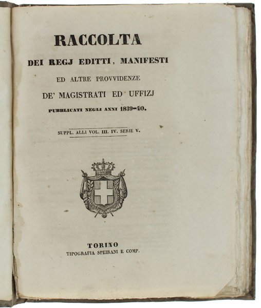 RACCOLTA DEI REGJ EDITTI, MANIFESTI, ED ALTRE PROVVIDENZE DE' MAGISTRATI ED UFFIZI pubblicati negli anni 1839-1840. Suppl. alli Vol. III. IV. Serie V.