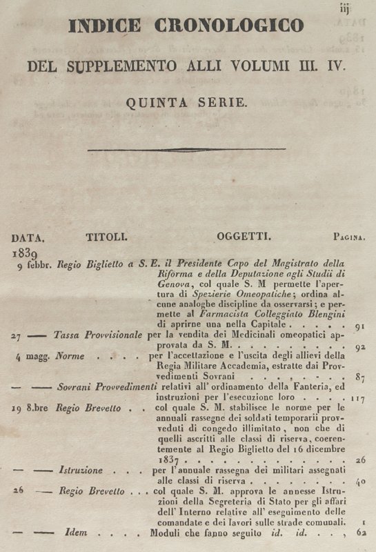 (Codice LO/7607) In 4º antico (23 cm) IV-179 pp. Emblema sabaudo al frontespizio. Volume di Supplemento, con indice cronologico e delle materie. Nitida impressione, su bella carta, pieni margini, con barbe (in buona parte intonso). Legatura cartone rustico originale, etichetta calligrafica. Ottimo volume. ~~~ SPEDIZIONE IN ITALIA SEMPRE TRACCIATA