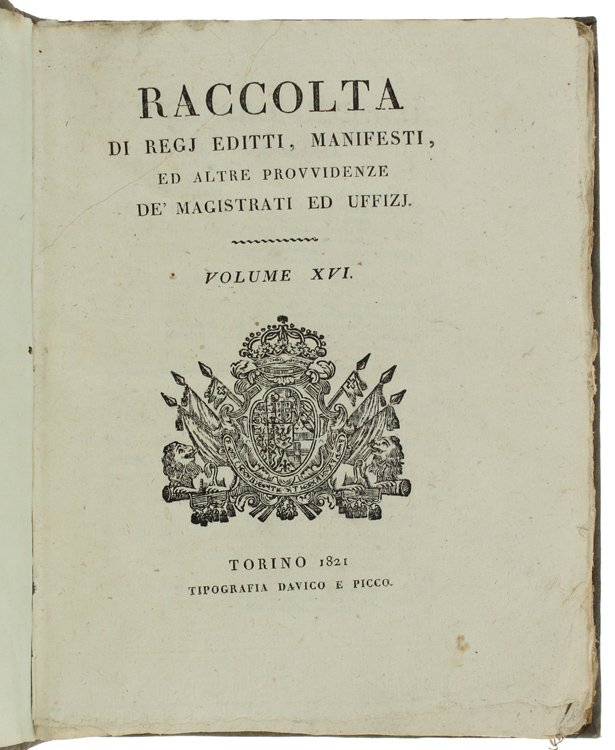 (Codice LO/7487) In 4º antico (23 cm) XIVI-402, pp. Grande emblema sabaudo al frontespizio. Con indice cronologico e indice delle materie. Nitida e fresca impressione su bella carta, ampi margini, con barbe (in buona parte intonsi). Legatura in cartone rustico originale, con etichetta calligrafica. Ottimo esemplare. ~~~ SPEDIZIONE IN ITALIA SEMPRE TRACCIATA
