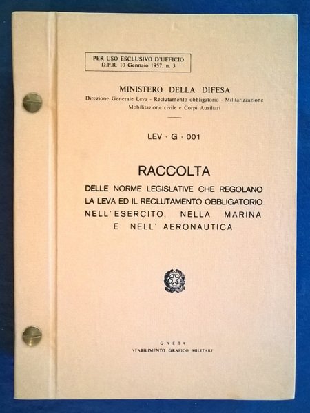 Raccolta delle norme legislative che regolano la leva ed il reclutamento obbligatorio nell'Esercito, nella Marina e nell'Aeronautica. LEV-G-001.