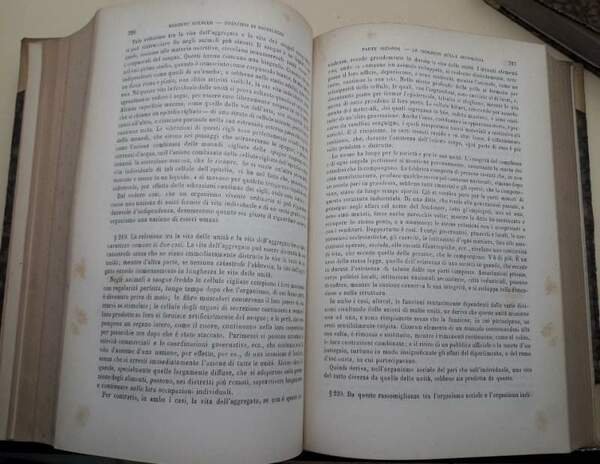 3 tomi, in 8', mz. perg. piatti marm.tass. e tit. in oro al dorso: tomo I- La sociologia nella storia, nella scienza, nella religione e nel cosmo, pp. CXIX(Boccardo)- Principii di sociologia di Herbert Spencer- vol I, prima traduzione in italiano del Professor Antonio Salandra, pp. 680; tomo II- Principii di sociologia di Herbert Spencer-vol II, pp. 419, indici; tomo III- principii di sociologia di Herbert Spencer-vol terzo parti VII e VIII Istituzioni Professionali-Istituzioni Industriali, prima traduzione italiana da cura di Guglielmo Salvadori, pp. 363; Volumi in buono stato, ordinarie bruniture , fioriture sparse, abrasioni all'unghia , segni del tempo. Buon es. ***Due to bureaucratic reasons, books dated over 70 years old cannot be immediately exported, please contact us before placing the order.***