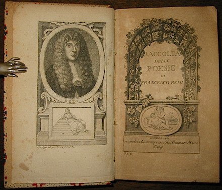 12mo (cm. 15,8), 5 cc.nn. (di cui antiporta e frontis.), XXIX-276 pp. Ritratto dell’Autore in antiporta inciso su rame da Gio. Lapi. Frontespizio anch’esso calcografico con cornice formata da tralci di vite e grappoli d’uva, al centro vignetta raffigurante una scena di baccanale. Cartonato decorato inizi ‘900 con titolo oro su tassello in pelle al ds. Carte ingiallite e con alcune lievi fioriture, altrimenti ottimo esemplare. Oltre alla Vita del Redi - tra gli Arcadi detto Anicio Traustio - scritta dall’abate Salvino Salvini fiorentino, nella raccolta sono contenuti ‘Il Bacco in Toscana’, sonetti, poesie diverse e le lettere. Gamba, 831.