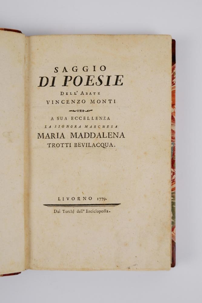 LIBROEdizione originale di tutte le opere. Unite su 24 carte, manoscritte con calligrafia d’epoca, “La Musogonia. Canto unico del cittadino Vincenzo Monti, In Milano, 1804, dalla Tipografia Sonzogno.Ottimo esemplare; solo un timbro all’occhietto della prima opera di Libreria antiquaria di Ravenna da anni chiusa al primo volume.Il “Saggio di Poesie” opera prima di Monti, impressa quando il poeta aveva appena 25 anni. Esemplare con i finalini incisi in rame alle pagine 34, 86, 87 e 97; altri esemplari presentano differenti incisioni in legno. «Le altissime speranze che il Monti giovinetto dava di sé nel proprio paese, indussero il cardinale Borghesi, nel suo ritorno a Roma dalla legazione di Ferrara, a condurlo seco, contando egli l’anno decimottavo dell’età sua. Stando in quella metropoli diede alla luce in un volume stampato a Livorno nel 1779 i primi saggi delle sue poesie, dedicandoli alla marchesa Bevilacqua di Ferrara [.]. E benché molte di quelle prime sue produzioni sieno poi state come troppo puerili rifiutate dal Monti, il che puossi dedurre dall’edizione Bodoniana dell’anno 1787; trovansi nondimeno anche in questa la “Visione d’Ezechiello” applicata ad un celebre predicatore in Ferrara, e scritta nel sedicesimo anno, l’”Entusiasmo melanconico”, le “Elegie”, quantunque assai ritoccate, ed altri componimenti pieni di grandissime bellezze di pensiero e di stile. Da che si ritrae che il Monti fu poeta per natura» (Giovanni Antonio Maggi, «Cenni intorno alla vita ed alle opere di Vincenzo Monti», Milano, Stella e Figli, 1828, pp. VII-VIII).Bibl.: Bustico, 1; Parenti, 352.