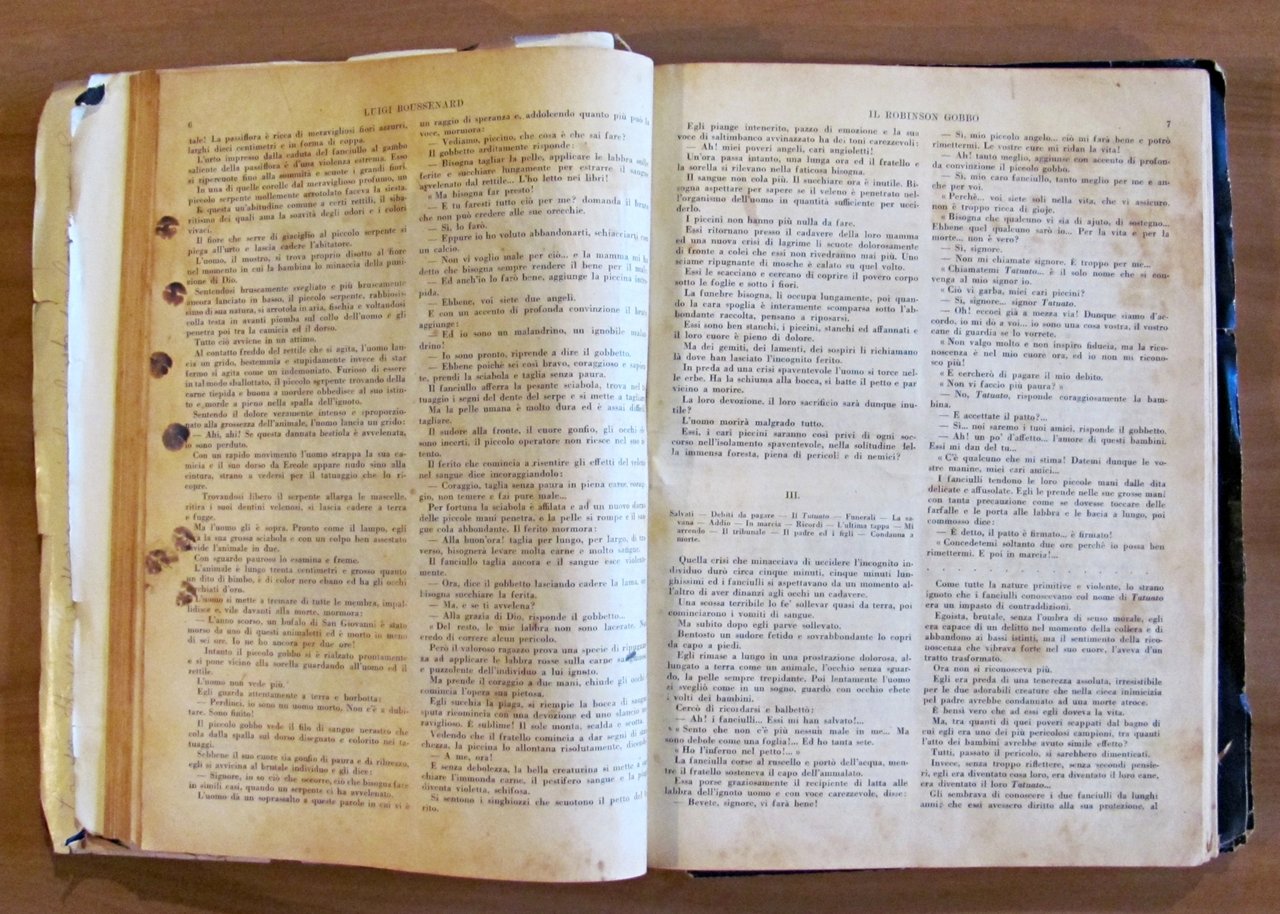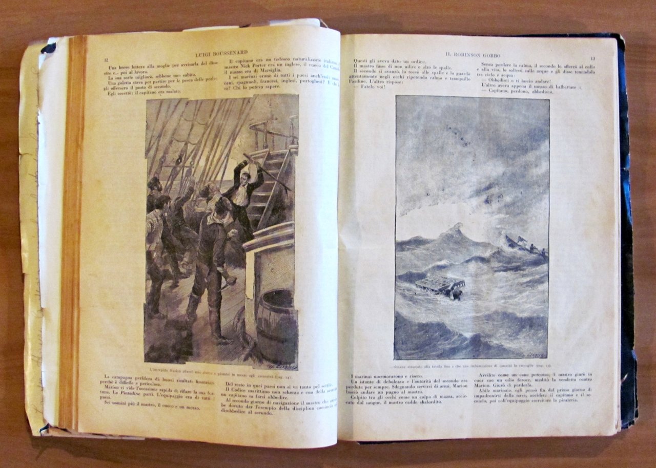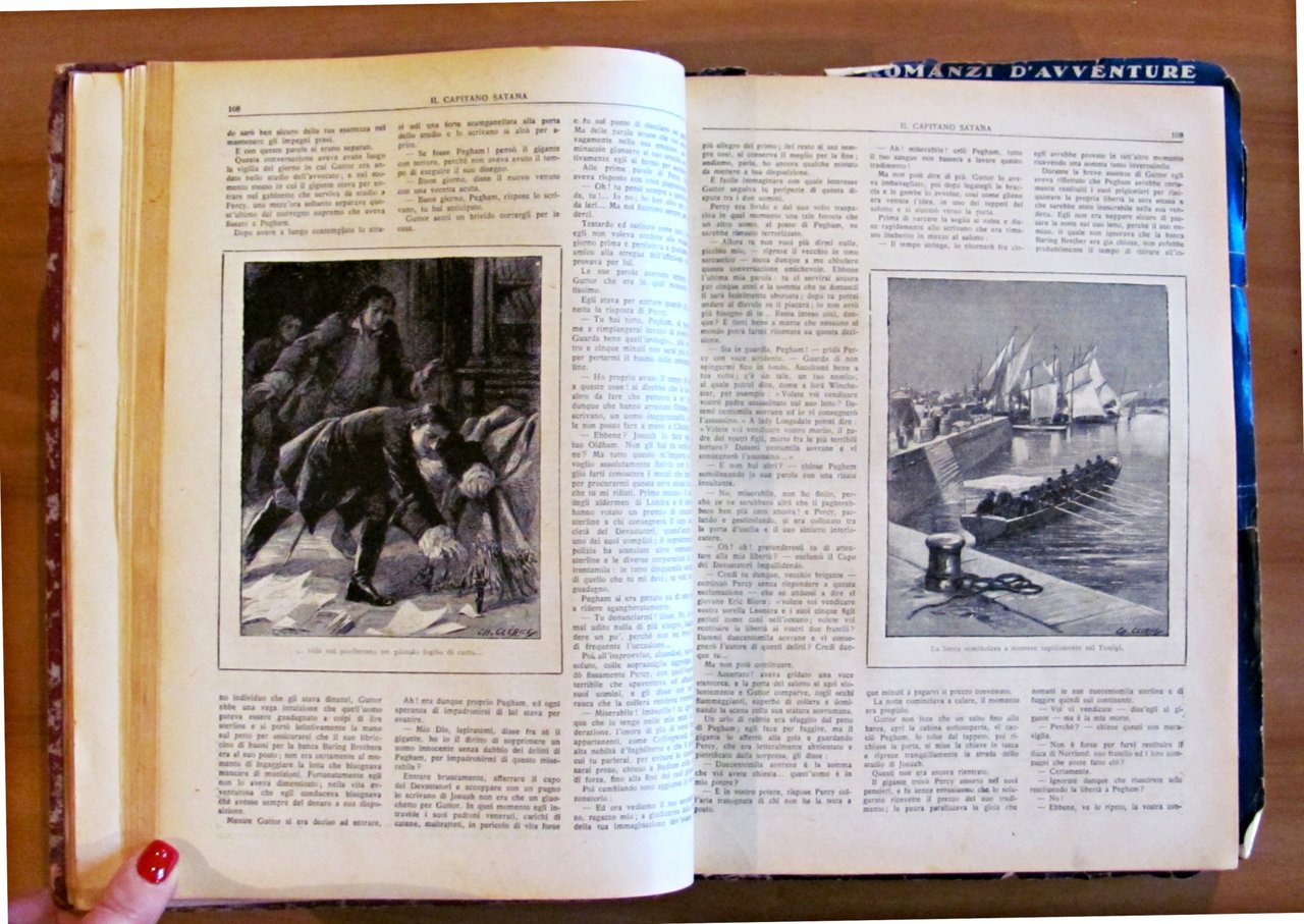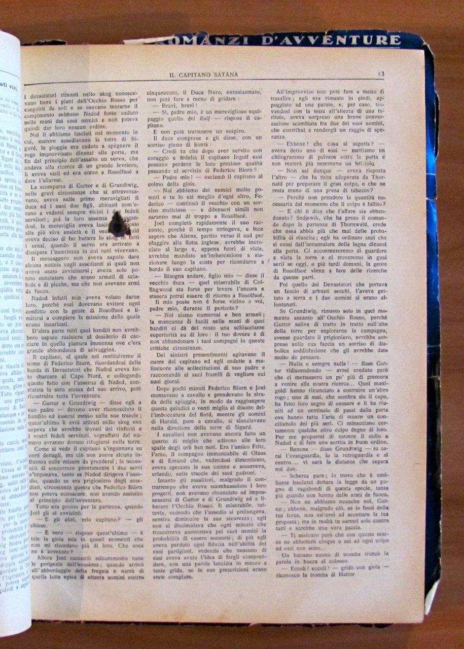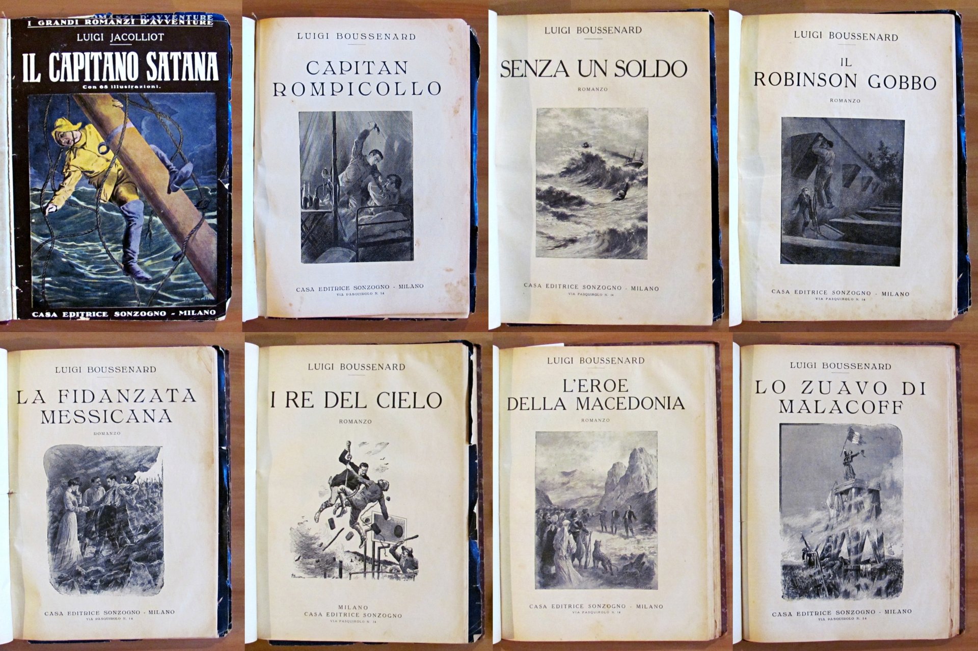 Raccolta di 8 racconti. Il Capitano Satana (L. Jacolliot); Capitan Rompicollo; Senza un soldo; Il Robinson gobbo; La fidanzata messicana; Il re del cielo; L'eroe della Macedonia; Lo zuavo di Malacoff. Illustrazioni in b/n n.t. a tutti i racconti di Clerice, Della Chiesa ed altri. Editore Sonzogno - Milano, 1923. Rilegatura coeva muta contenente gli 8 racconti rilegati, il primo con copertina in brossura originale rilegata all'interno e 4 ulteriori copertine originali conservate, non rilegate; di cui una (quella di Capitan Rompicollo) è restaurata e con scritte al retro. Qualche micro taglietto ai margini esterni, lievi fioriture del tempo e mancanze, in rari casi più accennate, e minime imperfezioni alla cerniera interna di pochissime pagine. Segni a matita colorata ai risguardi finali. 23x30,5; pp.181, 108; 94; 94; 104; 103; 96; 105. RARO e in BUONO STATO , Buono (Good)
