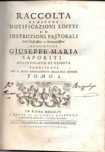 Raccolta di alcune Notificazioni Editti ed Istruzioni pastorali. per il buon regolamento della sua Diocesi, in 2 tomi