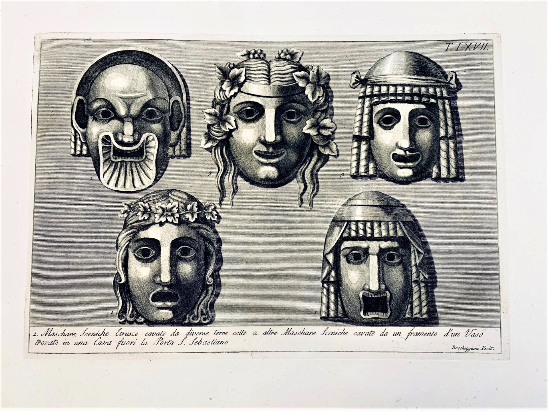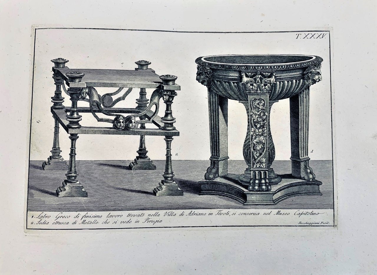 >un volume in-folio oblungo (280x390 mm.), legatura del tempo mezza pelle. Titolo inc. e 100 tavole numerate, I-C, numerate e firmate sulla lastra (Roccheggiani dis. e inc.). Ogni tavola ha una breve legenda descrittiva. Importante opera iconografica che descrive dettagliatamente vestiari, costumi, utensili, oggetti d'abbigliamento, pettinature, calzari, ecc. nonché su reperti archeologici minuti, sculture, vasellame, ecc. delle civiltà Egizia, Etrusca, Greca e Romana. Opera difficile a reperirsi completa delle 100 tavole, come è il presente esemplare, non comune e di grande interesse archeologico e artistico. Bell'esemplare marginoso, foglio di titolo con il margine inferiore corto, macchia marrone di 3 cmx1,5 nel margine inferiore delle tavole 12-14. Cicognara n.11781. Lipperheide n.112. Colas n.1562.