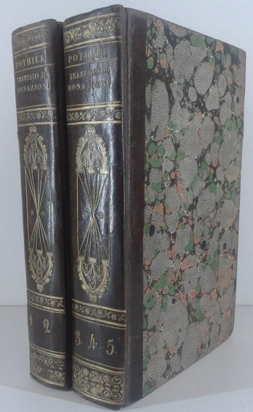 Cinque volumi rilegati in due tomi. Legatura in mezza pelle con titoli ed eleganti fregi in oro al dorso, in buone condizioni: leggere spelature alle cerniere e alle cuffie. Firma di appartenenza al foglio di guardia anteriore. Tagli colorati in giallo. Carte brunite con sparse fioriture