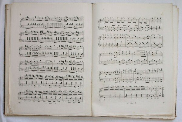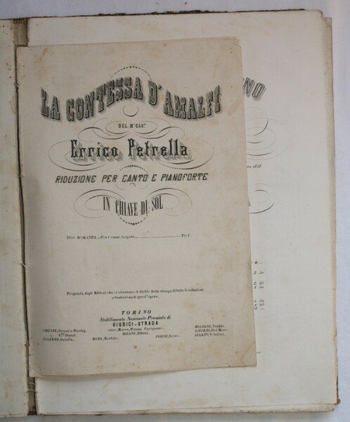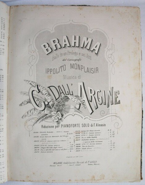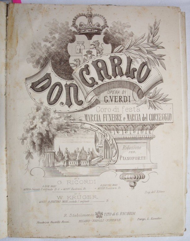 In 4. Dim. 34x26 cm. Pp. 134. Raccolta di dodici spartiti per pianoforte, la gran parte pubblicati tra il 1870 ed il 1880 circa, rilegati insieme in una copertina in mezza pelle. I compositori sono quasi tutti del XIX secolo, tra i più famosi: Giuseppe Verdi (1813-1901), J. Ascher (1829-1869), Vincenzo Robaudi (1819-1882). Tra i pezzi più famosi presenti citiamo: il Don Carlos, Non ti scordar di me, Alla stella confidente, Brahma. Alcuni spartiti della Ricordi e riportano timbro a secco della stessa. Carta spessa. Antica firma alla prima pagina di sguardia. Copertina in mezza pelle in discrete condizioni generali con diverse usure ai margini, angoli e dorso. Legatura lenta con rotture. Fioriture. Collection of twelve scores for piano, the greatest part of them published between about 1870 and 1880, bound together in an half lether binding. The composers are all of XIX century, among the most famous: Giuseppe Verdi (1813-1901), J. Ascher (1829-1869), Vincenzo Robaudi (1819-1882). Among the most famous pieces we cite: il Don Carlos, Non ti scordar di me, Alla stella confidente, Brahma etc. Some scores have been published by Ricordi and they have the embossed stamp of it. Wide paper. Ancient signature in the first paper. Half leather cover in fair general conditions with worn edges, spine and corners. Binding in good conditions. Foxings