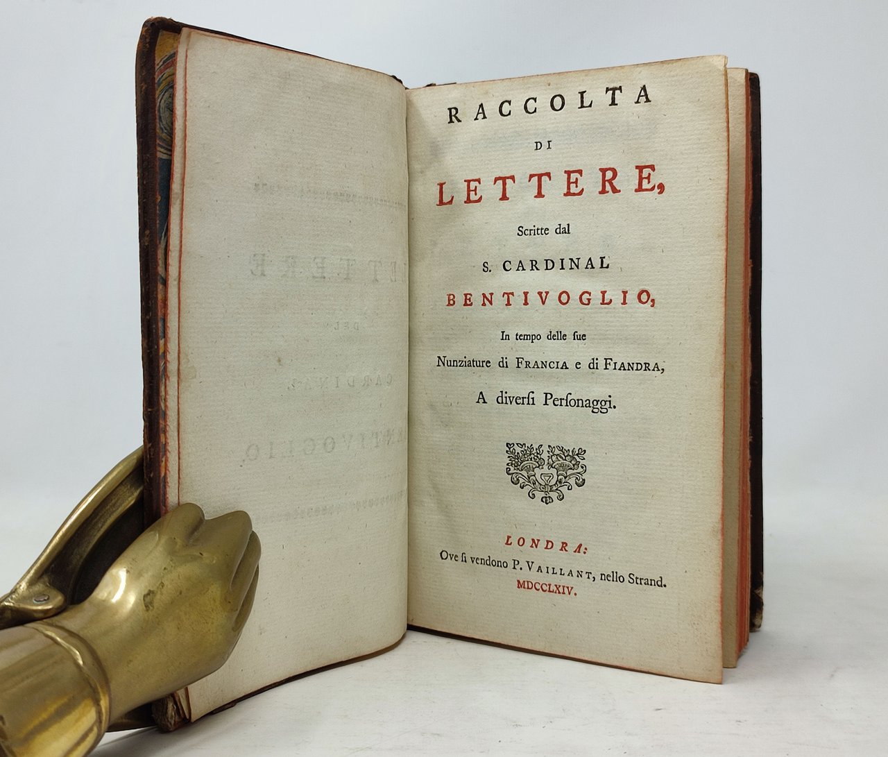 Formato: 12 x 18 cm circa. Tagli verniciati in rosso. Frontespizio in bicromia. Stato di conservazione: qualche segno del tempo e dell'utilizzo sulla coperta che presenta qualche taglietto e leggera abrasione sul dorso e sugli angoli. Una minuscola mancanza sulla linea di attaccatura del piatto anteriore al dorso ma, nel complesso, un esemplare decisamente buono. Interno molto fresco. Privo di timbri o altri segni. Coperta in pelle con nervi in rilievo e titoli e decorazioni in oro sul dorso. Da pagina 101 inizia la sezione dedicata alle 'Lettere del Cardinal Bentivoglio scritte in tempo della sua Nunziatura di Francia al Duca di Monteleone in Ispagna'. Epistolario che raccoglie una scelta di lettere del Cardinale Guido Bentivoglio (Ferrara 4 ottobre 1577 - Roma 7 settembre 1644) che dimostrò un grande interesse per le tematiche politiche, da lui trattate sempre in modo estremamente equilibrato.