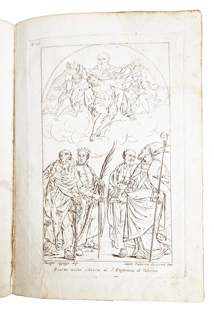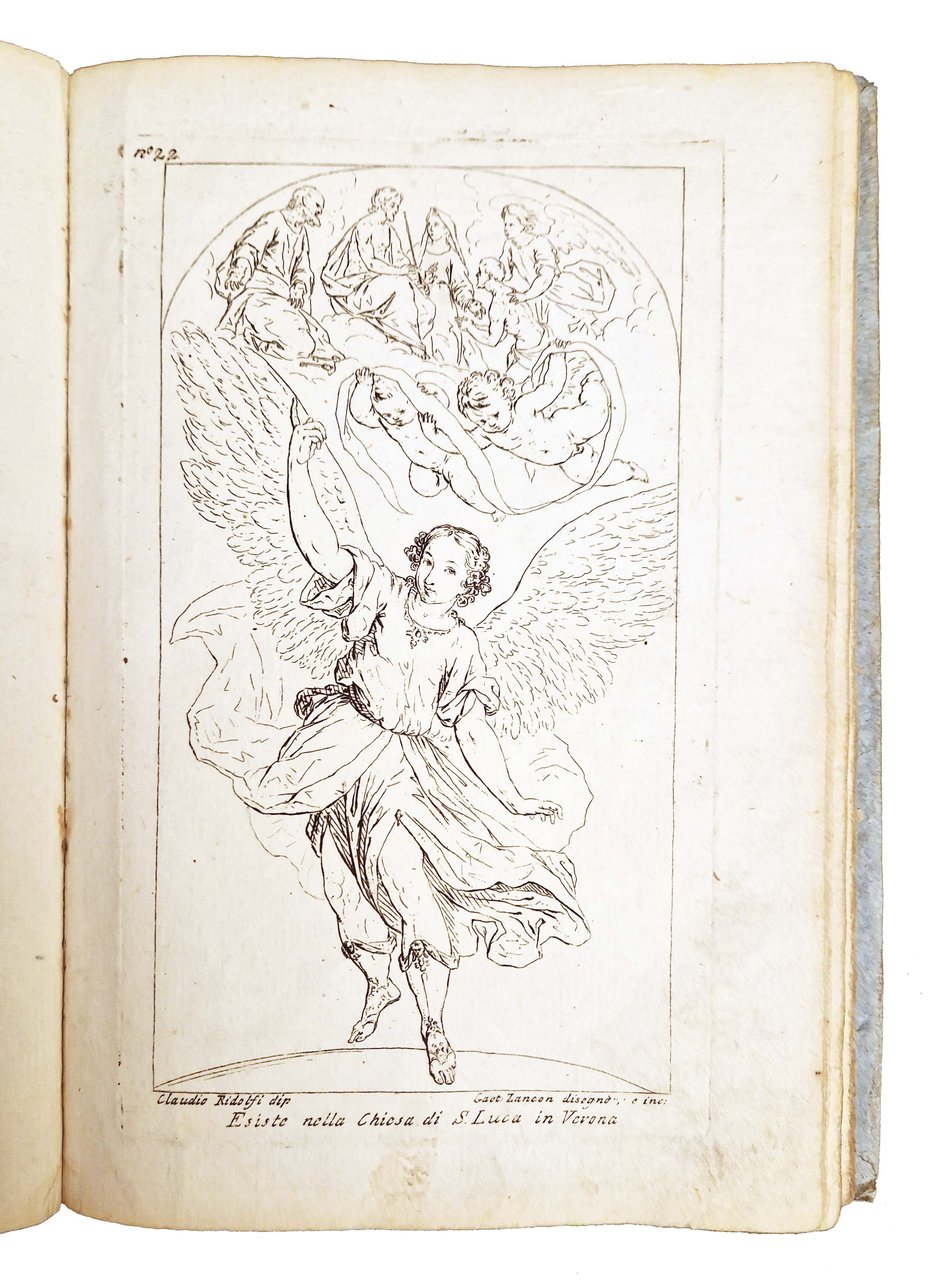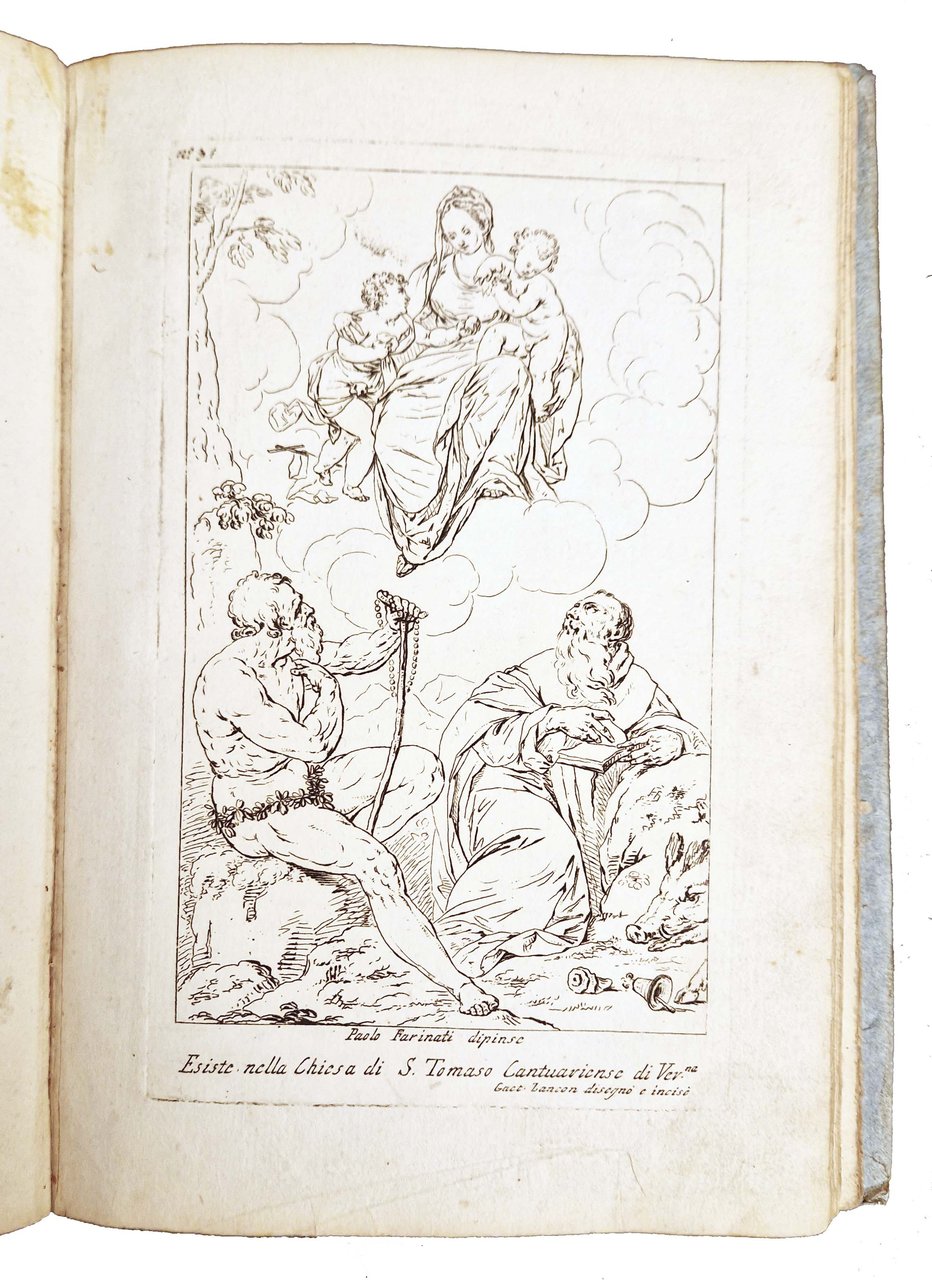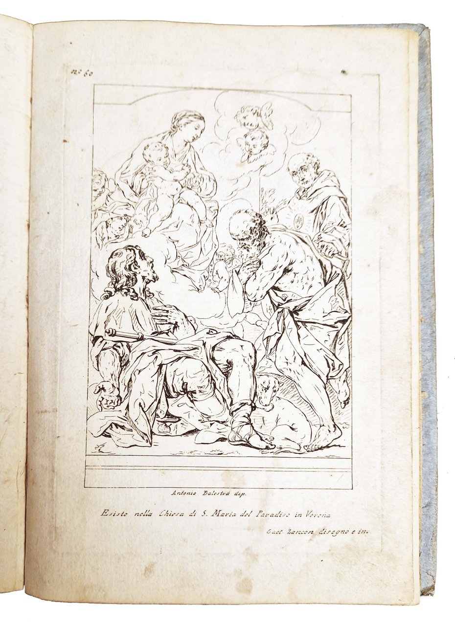 in-4°, 236x160, leg. in mezza pergamena e carta azzurra ai piatti, con carte marmorizzate alle guardie; [1], 60 c. di tav. calcografiche; front. calcografico. La data di stampa, non indicata al frontespizio, è desunta da NUC pre-1956. Contiene disegni di Pasqualotto, Tiziano, Brusasorzi, Raffaello, Dorigni, Farinati, India, Veronese, Ottini, Bassetti, Turchi, Montemezzano, Girolamo dai Libri, Bonifacio da Verona, Ridolfi, Sigismondo De Stefani, Carotto, Dal Moro, Caneri, Morando, Flacco, Badile, Turchi, Balestra, Giolfino, Cignaroli, Rotari, Monsignori, Torbido, Falconetto, Giarola, Guerri, Marchesini, Benfatto, Prunati, Creara, Ligozzo. Prov.: Etichetta di provenienza incollata al contropiatto anteriore con scritte (ex libris Marchionis De Monteynard Tencini in Delphinatu. C. Eisen del. N. Le Mire sculp.) e incisione in colore rosso (due leoni su una nuvola che reggono uno stemma nobiliare coronato, motti: pro Deo fide et rege; potius mori). Marchese Luigi Francesco di Monteynard (1713-1791), è stato un generale e politico francese, nativo della regione del Delfinato. Nel 1759 divenne luogotenente generale, il grado militare più alto a quell'epoca, dopo quello di maresciallo di Francia. Nel 1771 fu chiamato da Luigi XV a sostituire il duca di Choiseul come Ministro della Guerra. Nel corso dei tre anni del suo mandato egli intraprese numerose iniziative per migliorare la situazione dei soldati. Per questo venne portato ad esempio per l'Europa nel Dictionnaire philosophique di Voltaire. Divenne anche il primo governatore generale della Corsica e creò a Saumur la scuola di equitazione che, dopo la rivoluzione, darà origine al celebre corpo di cavalieri detto Cadre Noir. Nel 1775 dette inizio alla costruzione del castello di Cruzille à Tencin, nel quale però non abitò mai. Rif.: IT\ICCU\VIAE\032945. OCLC, 14153774. Cond.: Lievi tracce d'uso alla legatura. Presenza di macchie e fioriture alle carte interne. Frontespizio restaturato e rifoderato. Alcune antiche scritte infantili fatte a penna sul retro di alcune tavole.Tavola 59 restaurata in un angolo. Presenza di un disegno a china all'ultima carta; Mancanza di una porzione della guardia libera posteriore. Esemplare nel complesso in buone condizioni generali.