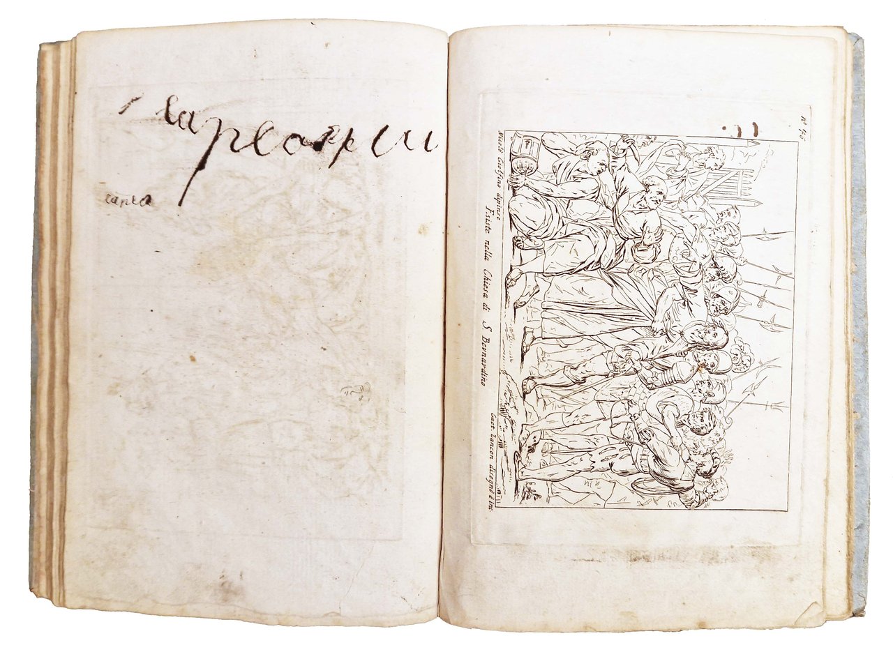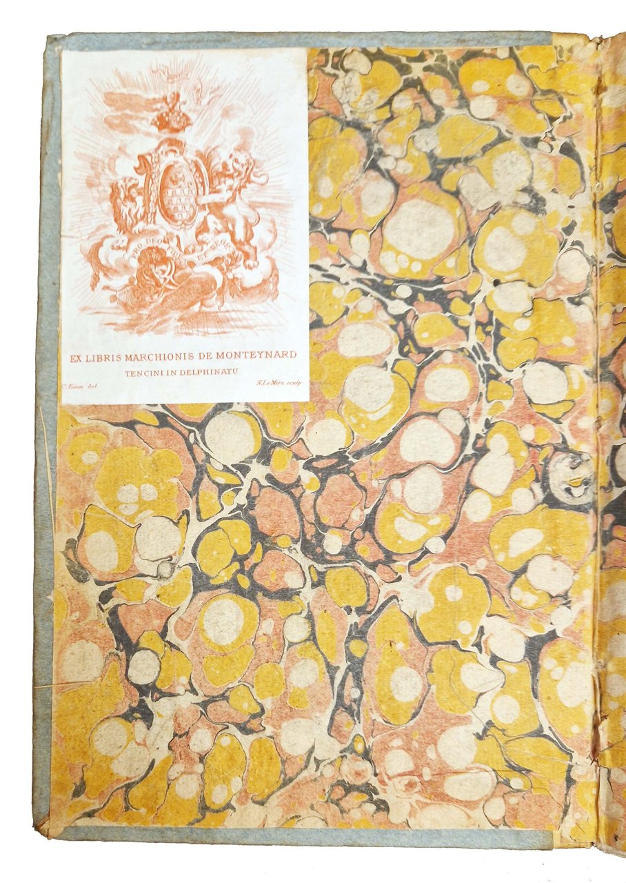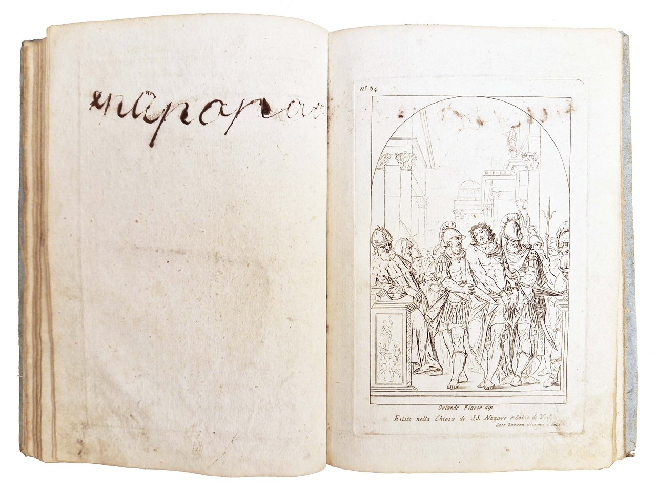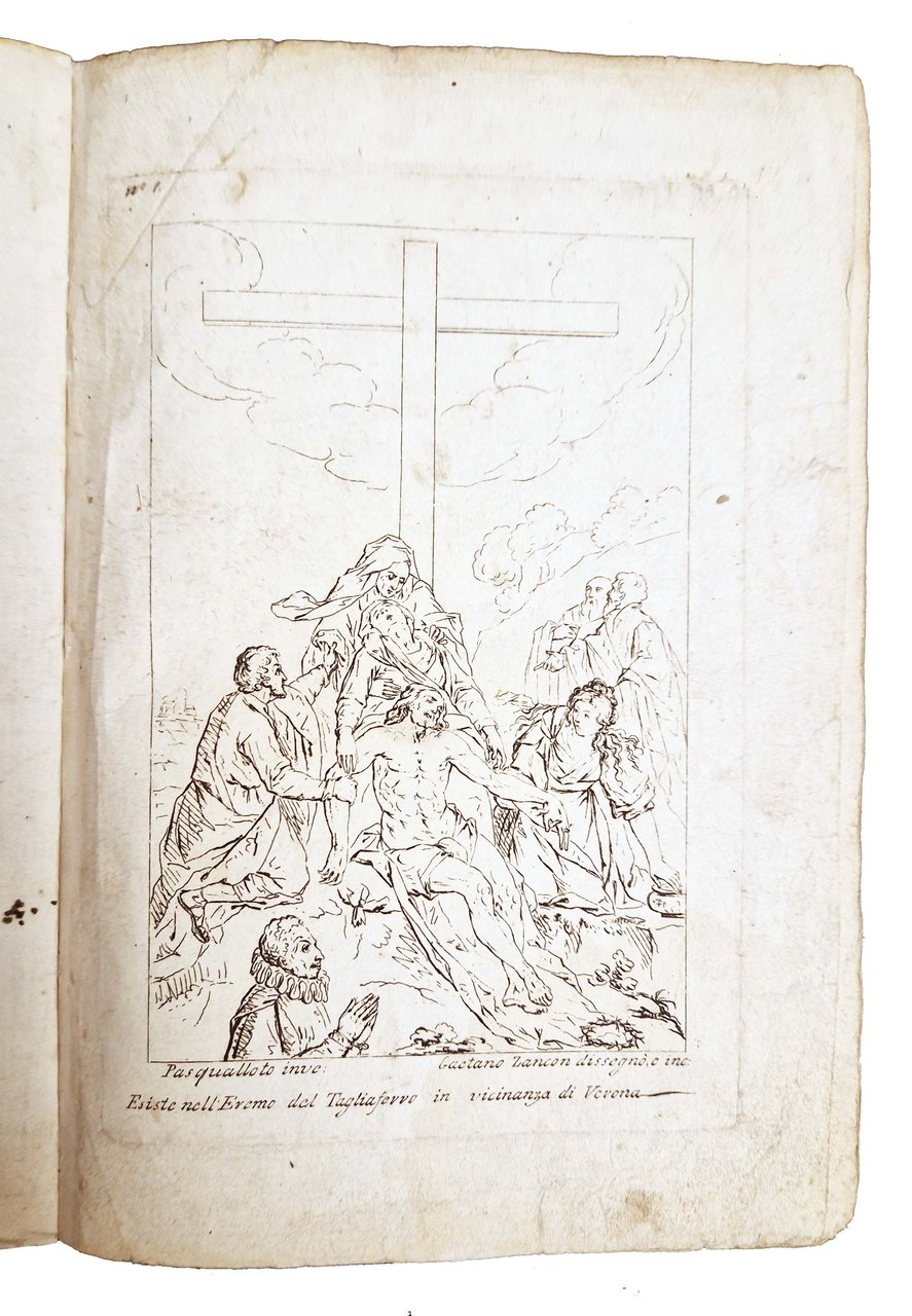 in-4°, 236x160, leg. in mezza pergamena e carta azzurra ai piatti, con carte marmorizzate alle guardie; [1], 60 c. di tav. calcografiche; front. calcografico. La data di stampa, non indicata al frontespizio, è desunta da NUC pre-1956. Contiene disegni di Pasqualotto, Tiziano, Brusasorzi, Raffaello, Dorigni, Farinati, India, Veronese, Ottini, Bassetti, Turchi, Montemezzano, Girolamo dai Libri, Bonifacio da Verona, Ridolfi, Sigismondo De Stefani, Carotto, Dal Moro, Caneri, Morando, Flacco, Badile, Turchi, Balestra, Giolfino, Cignaroli, Rotari, Monsignori, Torbido, Falconetto, Giarola, Guerri, Marchesini, Benfatto, Prunati, Creara, Ligozzo. Prov.: Etichetta di provenienza incollata al contropiatto anteriore con scritte (ex libris Marchionis De Monteynard Tencini in Delphinatu. C. Eisen del. N. Le Mire sculp.) e incisione in colore rosso (due leoni su una nuvola che reggono uno stemma nobiliare coronato, motti: pro Deo fide et rege; potius mori). Marchese Luigi Francesco di Monteynard (1713-1791), è stato un generale e politico francese, nativo della regione del Delfinato. Nel 1759 divenne luogotenente generale, il grado militare più alto a quell'epoca, dopo quello di maresciallo di Francia. Nel 1771 fu chiamato da Luigi XV a sostituire il duca di Choiseul come Ministro della Guerra. Nel corso dei tre anni del suo mandato egli intraprese numerose iniziative per migliorare la situazione dei soldati. Per questo venne portato ad esempio per l'Europa nel Dictionnaire philosophique di Voltaire. Divenne anche il primo governatore generale della Corsica e creò a Saumur la scuola di equitazione che, dopo la rivoluzione, darà origine al celebre corpo di cavalieri detto Cadre Noir. Nel 1775 dette inizio alla costruzione del castello di Cruzille à Tencin, nel quale però non abitò mai. Rif.: IT\ICCU\VIAE\032945. OCLC, 14153774. Cond.: Lievi tracce d'uso alla legatura. Presenza di macchie e fioriture alle carte interne. Frontespizio restaturato e rifoderato. Alcune antiche scritte infantili fatte a penna sul retro di alcune tavole.Tavola 59 restaurata in un angolo. Presenza di un disegno a china all'ultima carta; Mancanza di una porzione della guardia libera posteriore. Esemplare nel complesso in buone condizioni generali.