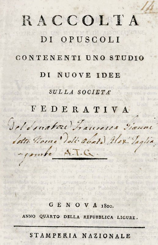LIBROPrima edizione.Antica nota di possesso al frontespizio. Margini piuttosto ridotti dalla rifilatura, ma nel complesso bell’esemplare.Il francescano Antonio da Coreglia in questo volumetto scrisse un appello per un progetto di società federativa italiana, una confederazione che si affermasse come «modello della possibile perfezione umana». Sul frontespizio, dopo la data: «anno quarto della Repubblica ligure». Contiene: «Pensieri sopra ad un sistema di associazione federativa»; «Un sogno politico diretto all’amico A. T. G.»; «Annotazioni al sogno politico diretto all’amico A.T.C in data 7 febbraio 1800 e poi pubblicato con la stampa sotto il titolo di Idea di una unione federativa utile alla Francia, ed all’Italia». -- Molto raro, una sola copia in Iccu (Biblioteca Nazionale centrale di Firenze).