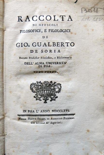 Raccolta di opuscoli filosofici e filologici di Gio. Gualberto De Soria Decano Professor Filosofico, e Bibliotecario dell’Alma Università di Pisa.