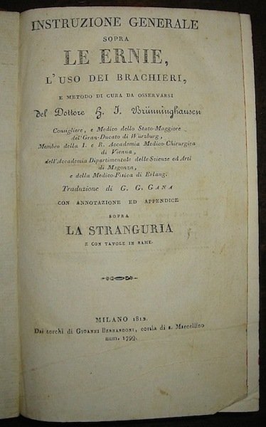 [Raccolta di opuscoli medici]: Brunninghausen G.I., Istruzione generale sopra le ernie, l’uso dei brachieri, e metodo di cura.con annotazione ed appendice sopra la stranguria., Milano, Bernardoni 1812, con 2 tavv. f.t. (segue) Nessi G., Discorso accademico medico chirurgico filologico intorno all’uso dell’acqua., Pavia, Capelli 1811 (segue) Birago C., Metodo facile, economico e spedito di guarire la rogna estratto dal dizionario francese delle scienze mediche., Milano, Ferrario 1821, con 4 tavv. f.t.