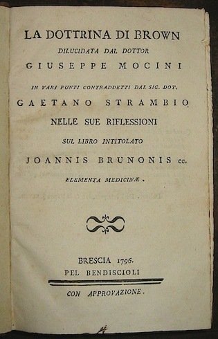 [Raccolta di opuscoli medici]: Mocini G., La dottrina di Brown., Brescia, Bendiscioli 1796 (segue) Sacchi Iacopo, In principia theoriae brunonianae animadversiones, Pavia, Comino 1793 (segue) Riccobelli P., Il sistema di Brown difeso da varie imputazioni., Venezia, s.t. 1797 (segue) Cattaneo F., Riflessioni sopra il sistema di Brown, Milano, Pogliani 1795 (segue) Franks G., Osservazioni sulla vita animale e l’apparenza di morte., Pavia, Comino 1795, con 1 tav. f.t.