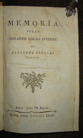 [Raccolta di opuscoli medici]: Picolli G., Memoria sulle malattie locali interne, Pavia, Comini 1799 (segue) Brera V.L., Divisione delle malattie fatta secondo i principj del sistema di Brown, Pavia, Eredi Galeazzi 1798, con 1 tav. f.t. (segue) Assalini P., Discorso sopra un nuovo stromento per l’estrazione della cateratta, Pavia, Comini 1792, con 1 tav. f.t. (segue) Angeli L., Raro concepimento accaduto fuori dell’utero., Imola, Stamperia del Seminario 1793, con 2 tavv. f.t. (segue) Bossi G.M., Uso pratico del mercurio nelle malatie veneree con una disertazione su la somiglianza dei fiori bianchi colla gonorrea nelle donne, Milano, Galeazzi 1786 (segue) Dehò P., Sulla malattia attualmente regnante ne’ bovini e sulla scielta del metodo