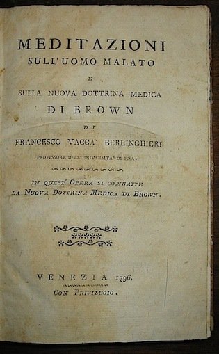 [Raccolta di opuscoli medici]: Vaccà Berlinghieri F., Meditazioni sull’uomo malato e sulla nuova dottrina medica di Brown, Venezia, s.t. 1796 (segue) Weikard, Dello stato stenico ed astenico predominante nelle malattie.traduzione.di Luigi Frank.con l’aggiunta delle sue osservazioni intorno l’uso di un nuovo rimedio Mercuriale nelle malattie Veneree, Venezia, Fenzo 1797 (segue) Marabelli F., Analisi chimica della china gialla., Venezia, s.t. 1800 (segue) Sangiorgio P., Della nuova nomenclatura chimica come non applicabile alla farmacia., Milano, Pogliani 1794