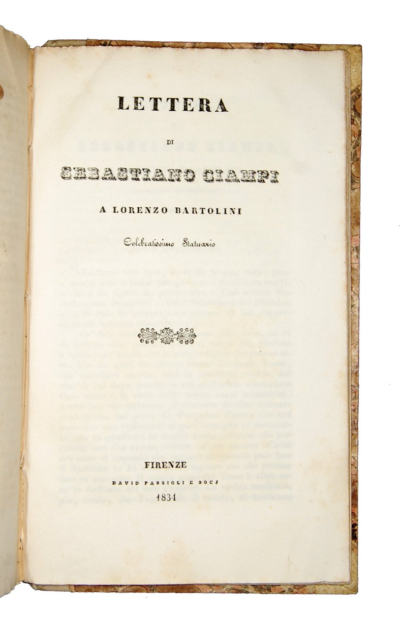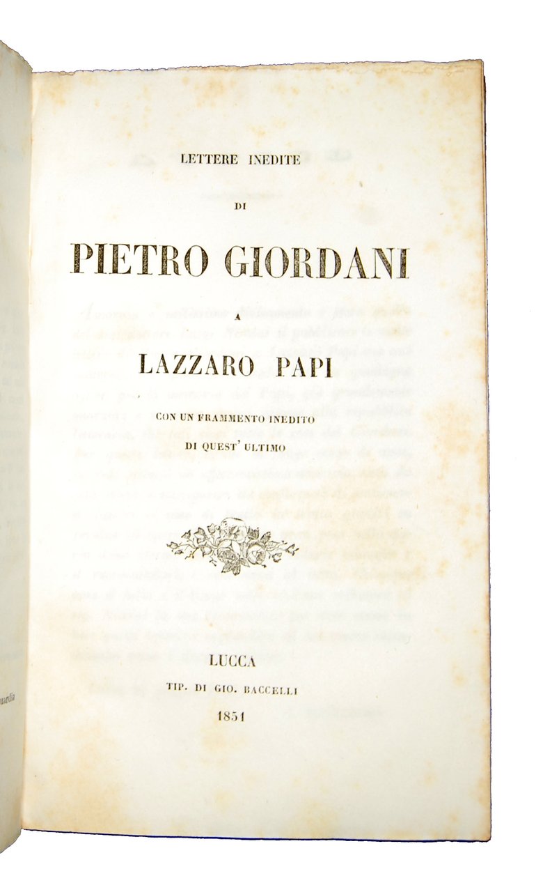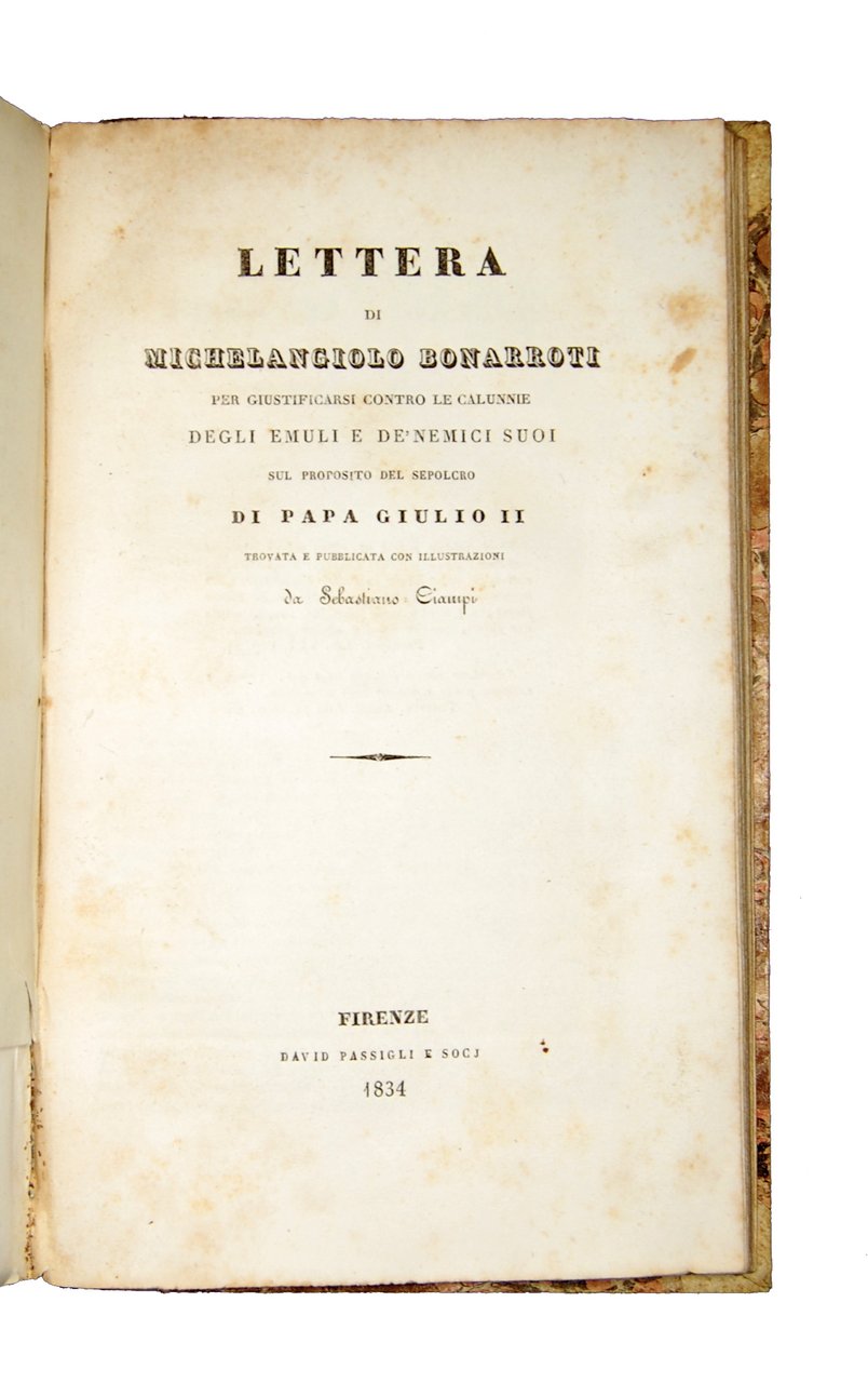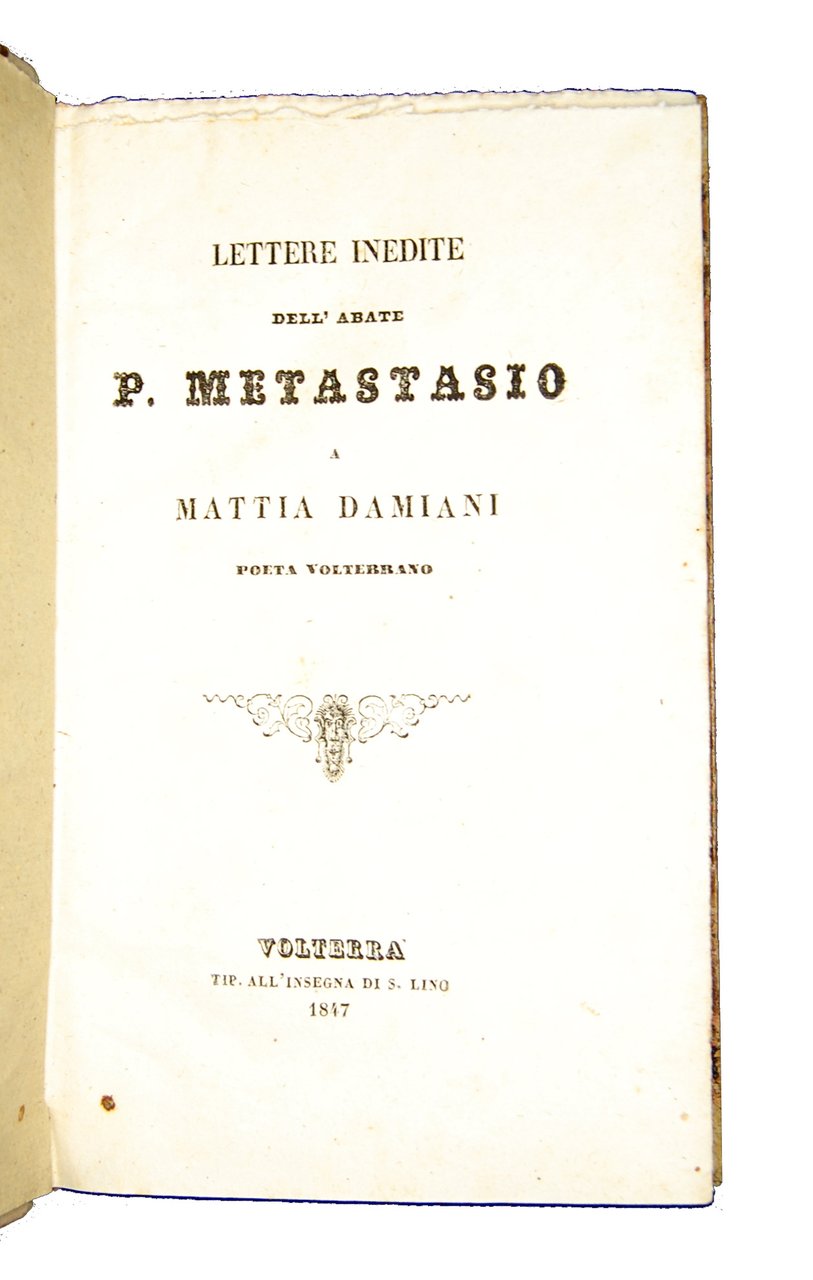 Raccolta di quattro lettere: [1.]: Metastasio, Pietro. Lettere inedite dell'Abate P. Metastasio a Mattia Damiani [.]. Volterra: Tip. all'insegna di S. Lino, 1847. [legato con]: [2.]: Giordani, Pietro. Lettere inedite di Pietro Giordani a Lazzaro Papi [.]. Lucca: Tip. di Gio. Baccelli, 1851. [legato con]: [3.]: Ciampi, Sebastiano. Lettera di Michelangiolo Bonarroti per giustificarsi contro le calunnie degli emuli [.]. Firenze: David Passigli e soci, 1834. [legato con]: [4.]: Ciampi, Sebastiano. Lettera di Sebastiano Ciampi a Lorenzo Bartolini [.]. Firenze: David Passigli e soci, 1834.