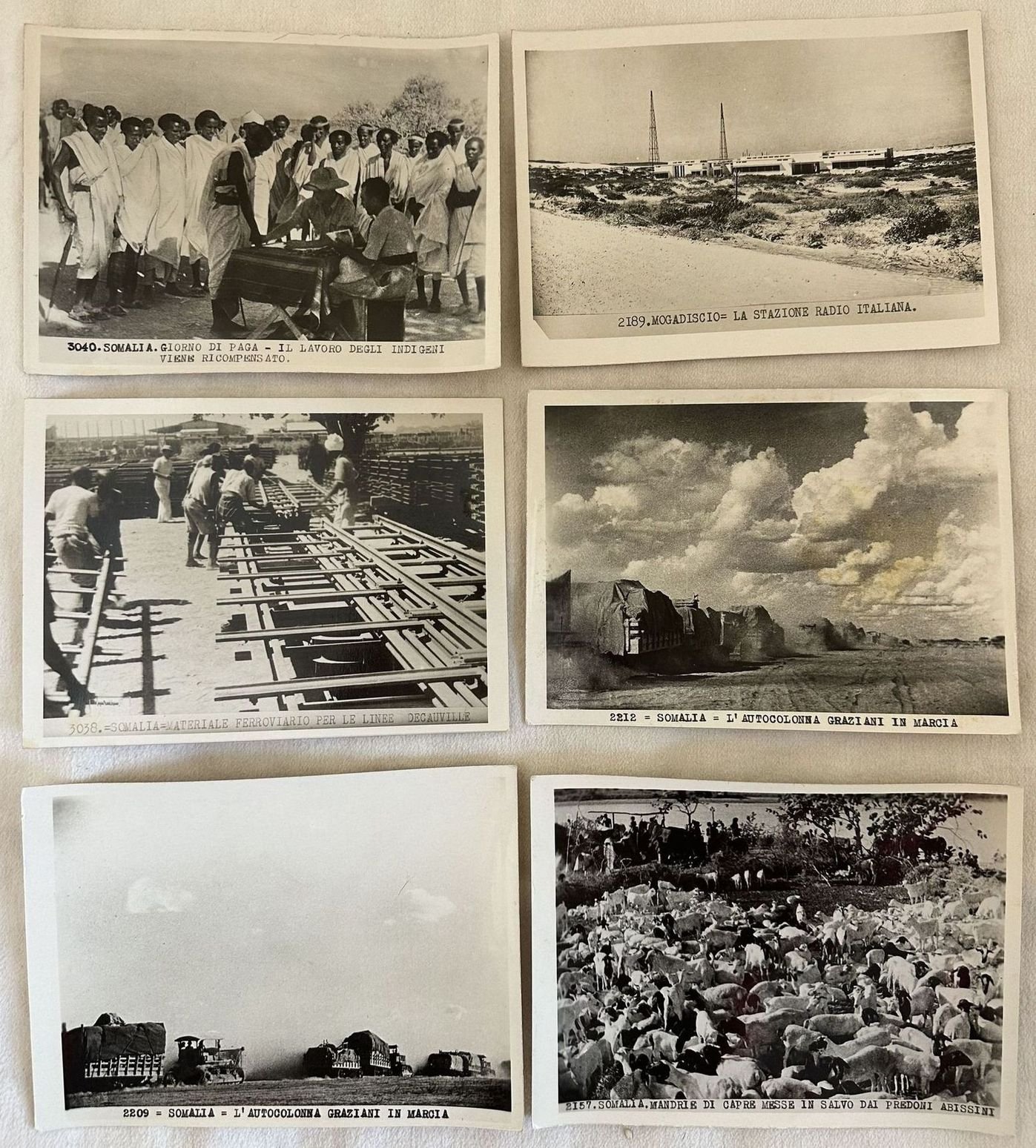 Raccolta di sei foto copie di fotografie realizzate nel 1936 circa nella Somalia italiana. Queste fotografie sono riproduzioni delle originali e sono state realizzate verso gli anni '70, '80. Riproducono paesaggi e momenti storici: Autocolonna Graziani in Marcia, Mandrie di capre messe in salvo dai predoni abissini; La stazione radio italiana di Mogadiscio; Il lavoro degli indigeni viene ricompensato; Materiale ferroviario per le linee Decauville. Dim. cm 13,5x18. In buone condizioni. Il governo fascista instituì nel settembre 1935 il "Reparto foto-cinematografico per Africa Orientale" con il compito di raccogliere materiale fotografico e cinematografico sull'Africa Orientale durante il periodo 1935-38. Ogni foto riportava indicazione dattiloscritte con indice della serie, elenco degli avvenimenti, numero di inventario. Oggi tutto questo materiale è conservato nel fondo dell'Istituto Luce.Collection of six photoes of photographies realized in 1936 circa in Somalia italiana. These photographies are reproductions of the originals and have been realized in 1970's 80's circa. They reproduce views and historical moments: Autocolonna Graziani in Marcia, Mandrie di capre messe in salvo dai predoni abissini; La stazione radio italiana di Mogadiscio; Il lavoro degli indigeni viene ricompensato; Materiale ferroviario per le linee Decauville. Dim. cm 13,5x18. In good conditions. The fascist government created in september 1935 the "Reparto foto-cinematografico per Africa Orientale" with the duty to collect photographic and cinematographic material about Africa Orientale during th period 1935-38. Each photo indicates typewritten indication with index of series, list of happenings, number of inventary. Today all this material is preserved in the archive of Istituto Luce.