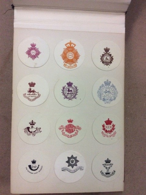 Cm. 13x21, mezza tela con angoli (abrasioni). Album contenente una raccolta di 288 stemmi a colori, stampati su tondi e applicati su cartoncini (12 per cartoncino). Sono stemmi di reggimenti appartenenti alle varie armi e alle varie contee britanniche, suddivisi in sei gruppi, con relativa legenda. Tra i reggimenti citiamo: Bedford regiment: 1st batallion - Berkshire regiment: 1st batallion.. Ben conservato.