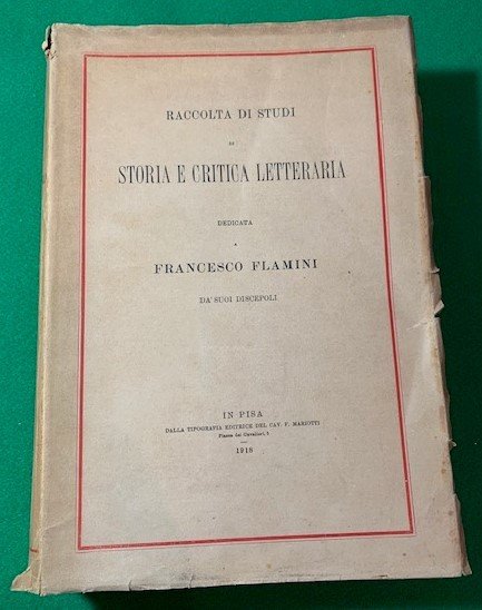 In 4°; XXIV, 809, (3) pp. ed un ritratto di Flamini in antiporta. Brossura editoriale, qualche traccia di sporco e strappetto, senza perdita di carta e per il resto esemplare in buone condizioni di conservazione. Esemplare ancora a fogli chiusi. Prima edizione di questa monumentale raccolta di scritti su argomenti classici di critica letteraria, dedicati al celebre critico, letterato, poeta ed accademico d'Italia, Francesco Flamini (Bergamo, 24 maggio 1868 - Pisa, 17 marzo 1922). Prima edizione.
