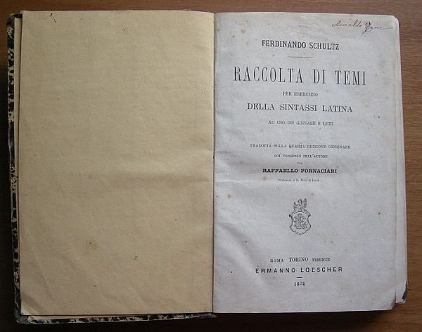 In 16? (cm 19,5), Leg. coeva mz. pelle, piatti marmorizzati, pagg.(6)-342-(2) titoli in oro al dorso, firma d'appartenza al frontespizio, segni del tempo alla cop. e al dorso, buon es. Solo libro primo. Edizione non censita in Iccu. L'opera contiene temi da tradurre in latino usando gradatamente tutte le regole della sintassi; la materia dei temi "? presa dalle conse antioche de' Greci e de' Romani, s? da render dimestici gli scolari con certi fatti e usanze che debbon sapere".