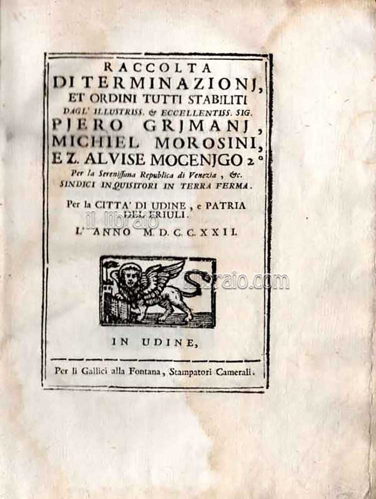 in 8°; pp. 146 (2); leg. in cartonato editoriale d'epoca. Sul frontespizio appare il leone di S. Marco con il libro aperto; testatine e capilettera xilografati. Ampia ed interessante raccolta di terminazioni relative alla città di Udine e del Friuli riguardanti i dazi dei vini e di altre merci, il contrabbando, licenze d'armi, scuole, elezioni dei Nodari, il Foro criminale e Foro civile, ecc. (condizioni generali molto buone; marginali aloni d'umidità)