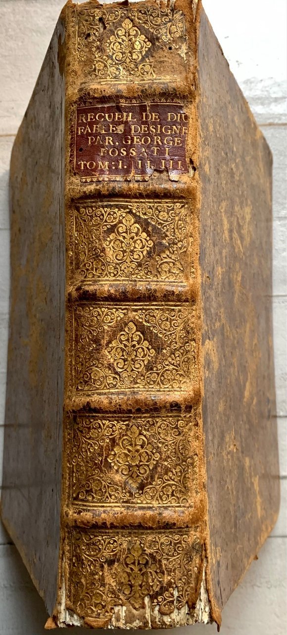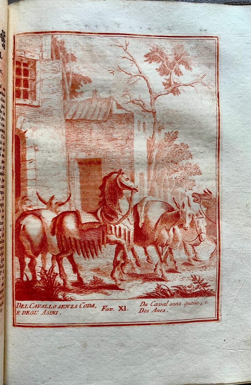 >Tre tomi rilegati in volume in 4to, pp. (8), 44; (16), 48; (20), 76 con complessive 88 tavole incise su rame e stampate in varie tonalità di rosso a piena pagina (inclusi i due frontespizi bilingue italiano e francese incisi entro elaborato cartiglio in rosso al primo tomo) e 7 vignette nel testo. Testo su 2 colonne in italiano e francese. Purtroppo mancano le pagg. 27-30 al primo tomo e 22 tavole (10 al primo tomo, 7 al secondo tomo e 5 al terzo tomo). Bella legatura coeva in piena pelle con nervi e ricchi fregi oro, titolo su tassello al dorso. Si tratta di uno dei libri più inusuali stampati a Venezia nel XVIII secolo, raro a reperirsi completo di tutte le tavole. Qualche difetto alla legatura.