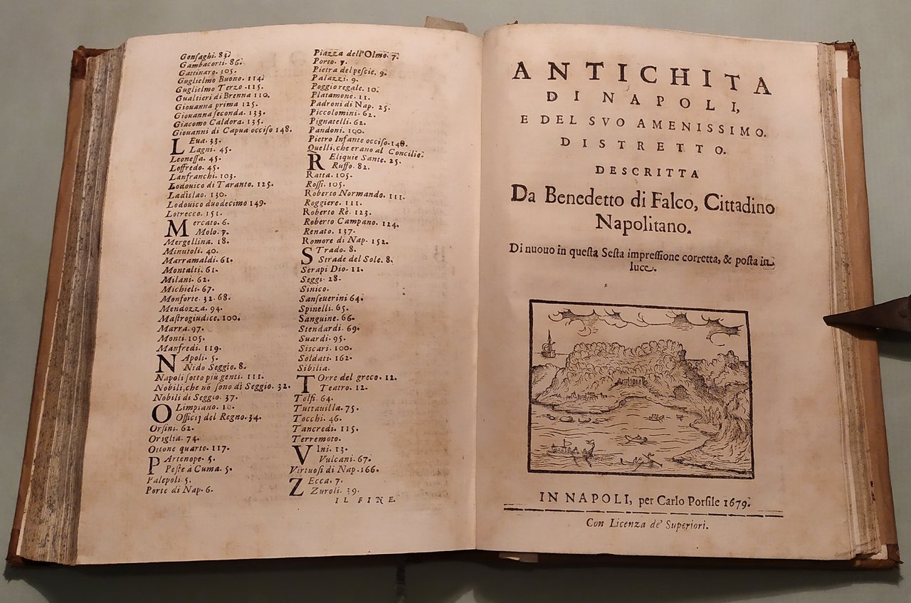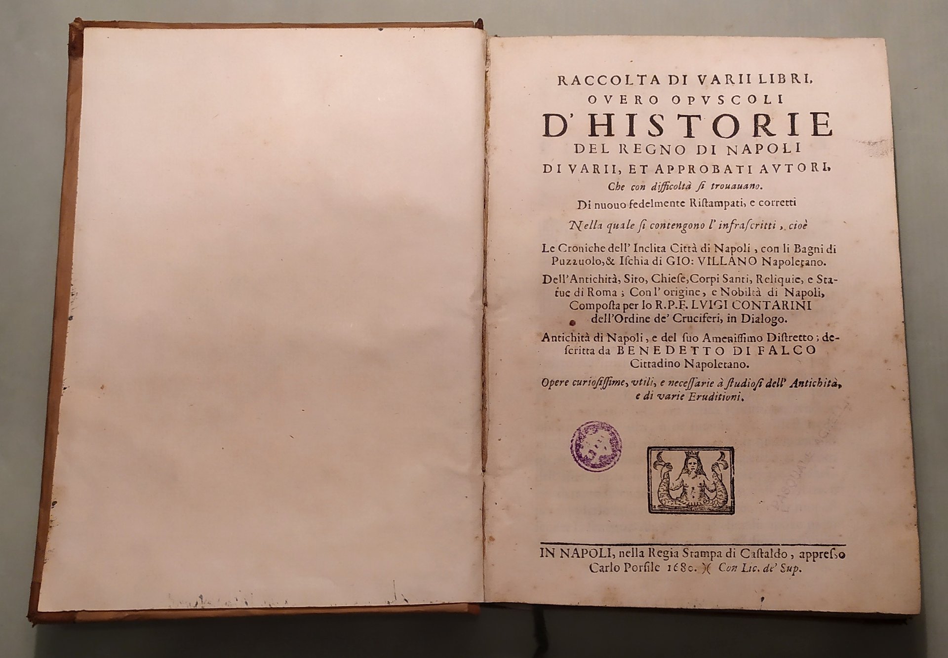 In Napoli, nella Regia Stampa di Castaldo, appresso Carlo Porsile, 1680. In8vo (cm.22x17); 4 pagine non numerate (frontespizio generale, dedica, avviso al lettore, imprimatur) segue la ristampa delle tre seguenti opere del XVI sec. riguardanti Napoli, Pozzuoli, Ischia e Roma, ciascuna con proprio frontespizio: I) Croniche de la Inclita Cità de Napole emendatissime con li Bagni de Puzzolo, & Ischia, di Gio. Villano. Pp.120, 8n.nn. Al frontespizio vignetta con il Castello d’Ischia. II) Dell'antiquità, sito, chiese, corpi santi, reliquie, et statue di Roma. Coll'origine, e nobiltà di Napoli di Luigi Contarini. In Napoli, presso Gioseppe Cacchij, 1569 et ristampato per Carlo Porsile, 1678. Pp. 92, 5n.nn.; 170, 2n.nn. III) Antichità di Napoli e del suo amenissimo distretto decritta da Benedetto di Falco. In Napoli, per Carlo Porsile, 1679. Pp.64. Al frontespizio vignetta con il seno di Baia. Timbro di biblioteca estinta al frontespizio generale. Mezza pelle coeva, dorso a cordoni con titlo e fregi in oro. Santoro, 2185; BL 17th Century Italian Books II, pag. 176; Giustiniani, pag. 122.