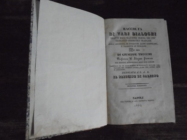 NAPOLI, SEGUIN, 1834. Tratti dall`illustre penna dei pi eleganti gramatici Francesi coll` aggiunta di parecchi altri compilati, e tradotti in Italiano per cura di Giuseppe Trucchi. Professore di lingua francese per servire di esercizio alle due lingue. Corredati da un gran numero di espressioni tecniche particolari del suddetto idioma, e da una lunga lista di Gallicismi. Dedicata a S.A.R. IL PRINCIPE DI SALERNO. Seconda Edizione. In 8: pp. 296. Testo su due colonne. Leg. in mz. pelle coeva con tit. in oro al dorso. Bruniture.