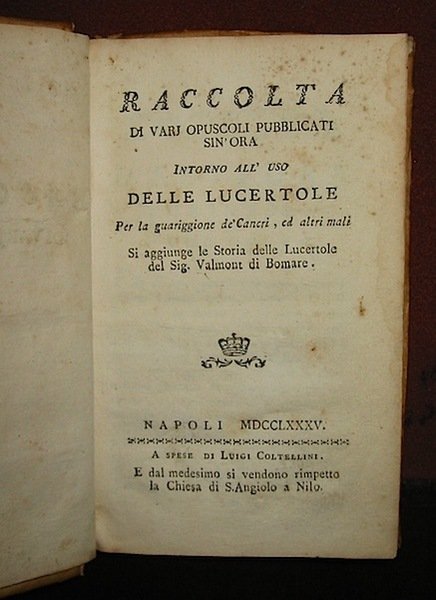 Raccolta di varj opuscoli pubblicati sin’ora intorno all’uso delle lucertole per la guariggione de’ Cancri, ed altri mali. Si aggiunge la Storia delle Lucertole del Sig. Valmont di Bomare
