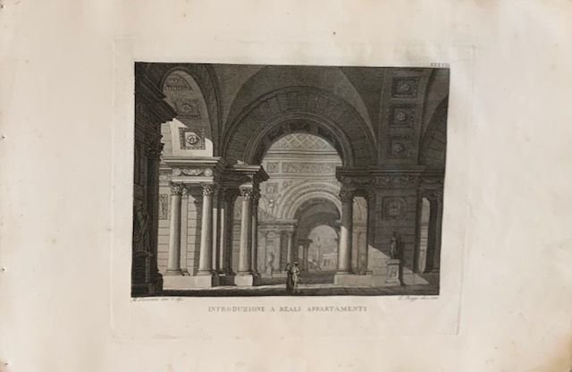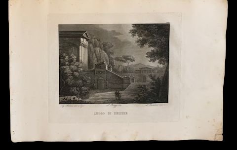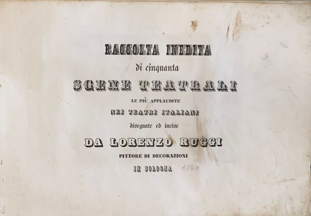 In oblungo; 51 cc. Legatura in carta coeva con spago a vista, qualche traccia di foxing, qualche leggerissimo alone, una lieve traccia di sporco e tre pieghette della carta pres stampa al sfrontespizio, ma nel complesso, esemplare in buone-ottime condizioni di conservazione. Frontespizio e 50 bellissime incisioni a piena pagina con immagini di scenografie teatrali. Lorenzo Ruggi fu un abile incisore bolognese, allievo del grande, Francesco Rosaspina (Montescudolo, 2 gennaio 1762 Bologna, 2 settembre 1841). Quest'opera raccoglie 50 scene teatrali realizzate nei principali teatri italiani nella prima metà dell'ottocento disegnate dallo stesso Ruggi che era solito realizzare scene teatrali ma anche da D. Palagi, D. Corsini, M. Brazioli, L. Cini, M. Berti, D. Ferri, F. Cocchi, G. Boucher, G. Badiali, R. Fantuzzi, G. Savini, F. Antolini, R. Liverani, A. Grati, M. Bracioli, L. Martinelli, G. Tibaldi etc. Prima edizione in buone-ottime condizioni di conservazione.