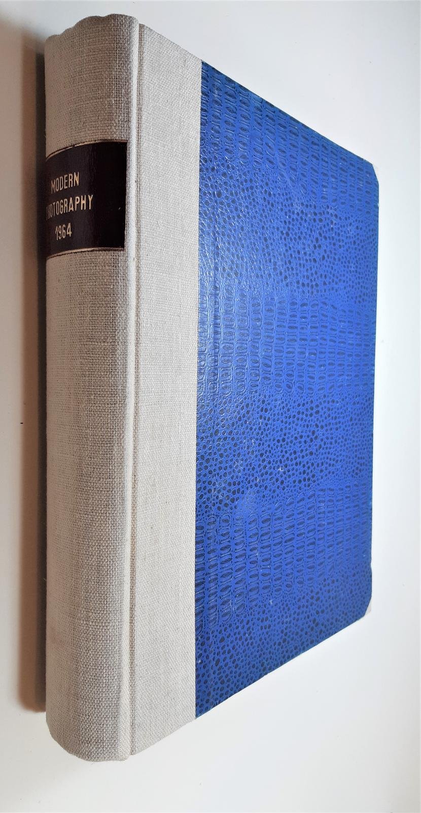 Raccolta Modern Photography maggio dicembre 1964. Copertina rigida in similpelle blu con punte e dorso in tela grezza con tassello al dorso leggermente ingialliti alla prima pagina bianca timbro di possesso del precedente proprietario, solo la prima rivista rilegata presenta pagine ondulate per umidit‡ e tracce ruggine al margine interno, in buono stato cm 28,5 x 22,5 x 5