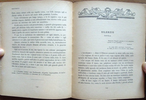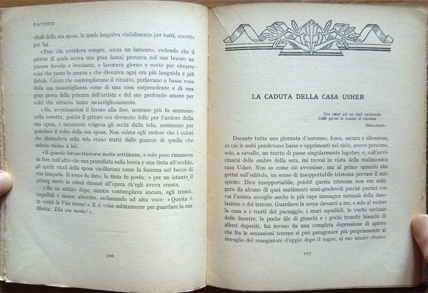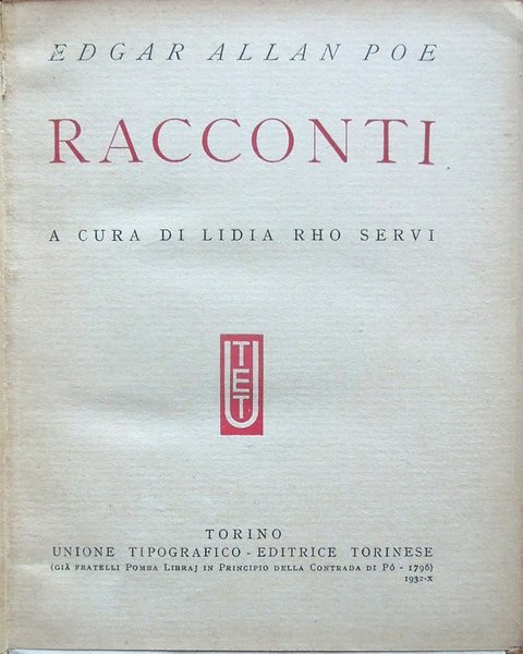 In-16°, pp. 187, (1), legatura editoriale con titoli e fregi in oro al piatto anteriore e al dorso. Con un ritratto di Poe fuori testo, in bianco e nero. Normale patina del tempo alle pagine, con leggere arrossature dovute al tipo di carta. Per il resto, in buono stato. Volume numero 22 nella collana di traduzioni "I grandi scrittori stranieri" diretta da Arturo Farinelli dell'Accademia d'Italia. Indice: Introduzione; La mascherata della morte rossa; Una discesa nel Maelström; Il gatto nero; Eleonora; Metzengerstein; William Wilson; Il ritratto ovale; La caduta della Casa Usher; L'uomo della folla; Silenzio; Perdita di fiato; La lettera rubata.